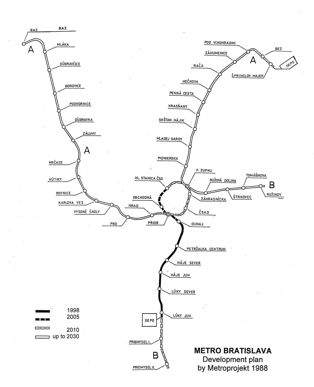 Metro sa malo budovať po etapách, pričom prvá (linka B), ktorej realizácia začala v roku 1988 (po neúspešnom pokuse z roku 1983), mala byť dokončená v rokoch 1998, resp. 2000. Spájať mala juh Petržalky so stanicou Dunaj (v blízkosti dnešnej Eurovey), v neskorších fázach sa mal postaviť ďalší úsek smerom na Hlavnú stanicu (2005) a okruh na Hrad (2010).