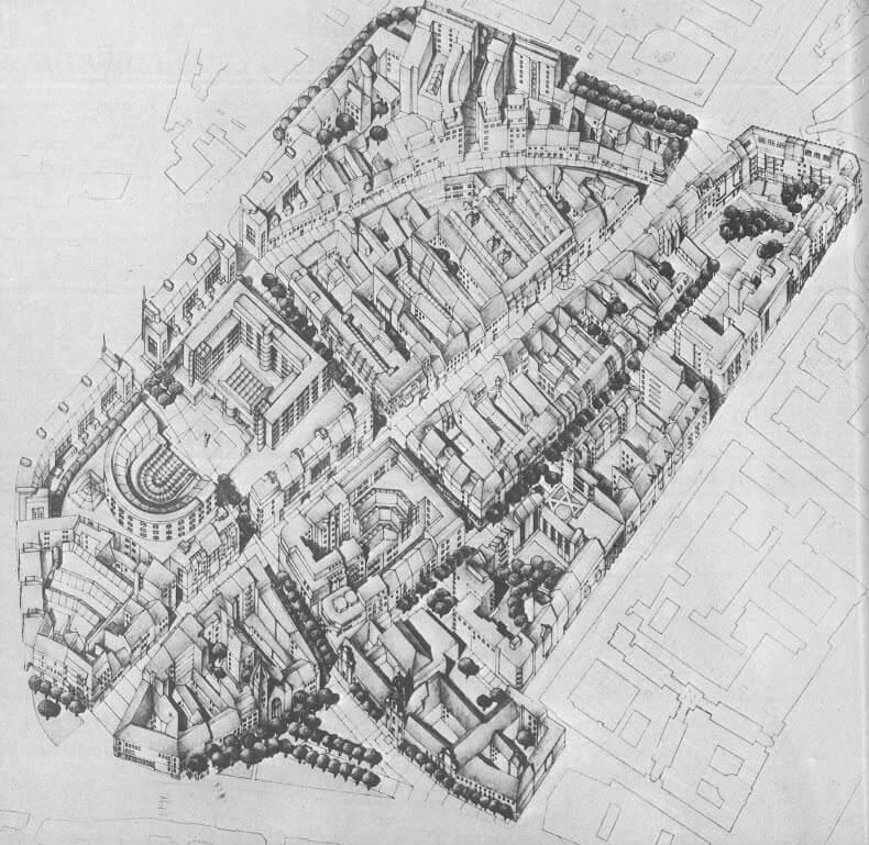 Zamýšľaná prestavba Obchodnej a okolia od architekta Ivana Marka. Zdroj: Stavoprojekt Bratislava 1949-1989