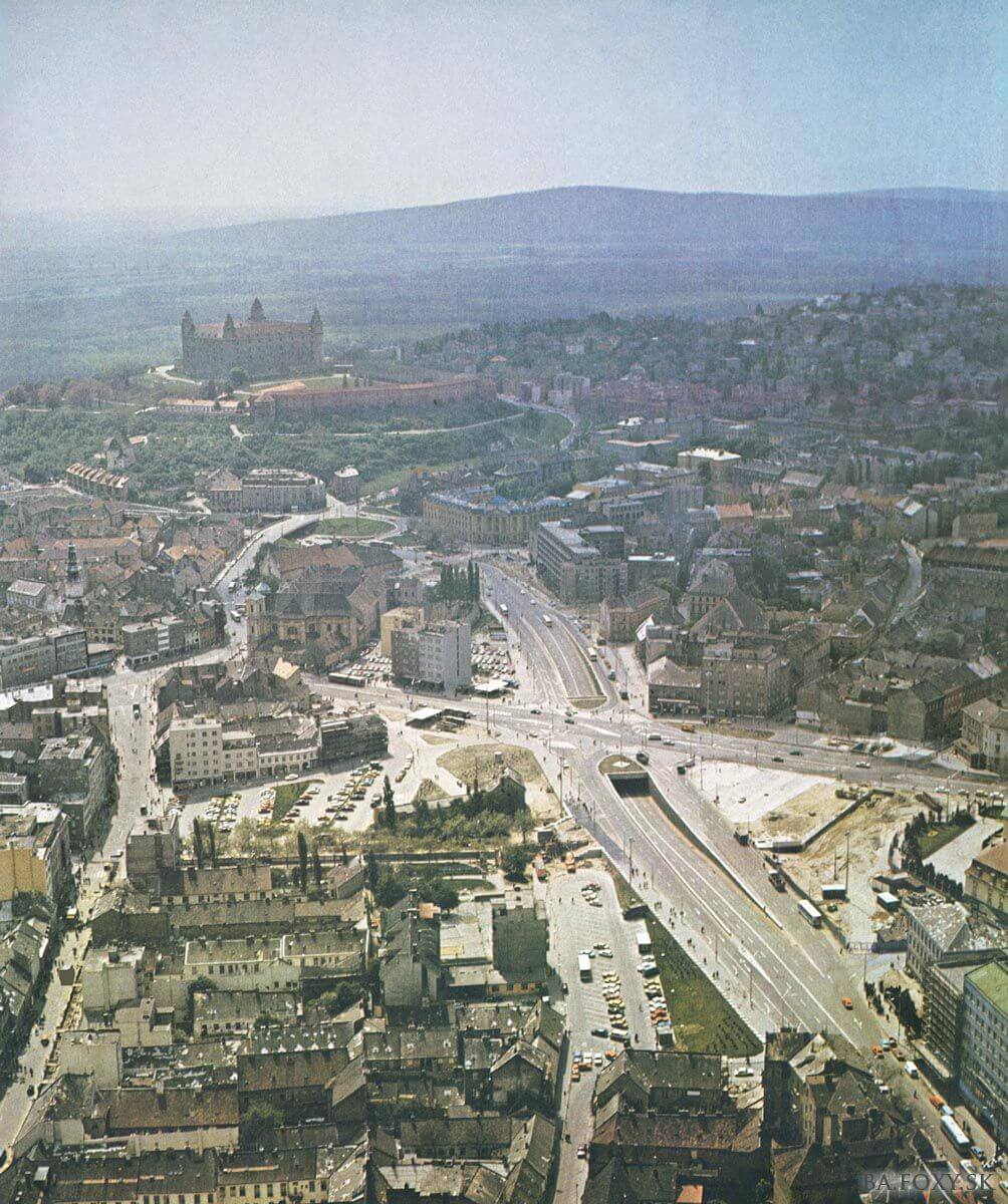 Výstavba Staromestskej a križovatky na Hodžovom námestí priniesla zánik celých mestských štvrtí. Zdroj: BA.FOXY.sk