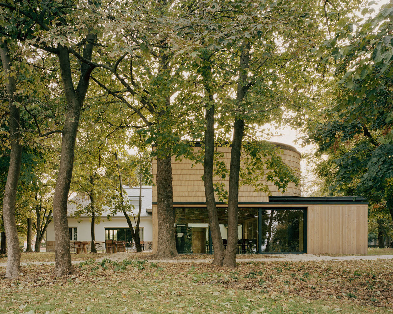 Zatiaľ čo pri pôvodnej budove architekti vo veľkej miere rešpektovali jej architektúru a materialitu, nový trakt, ktorý vznikol v zadnej časti riešeného územia, sa rozhodli navrhnúť v úplne inom duchu. Výber materiálov vychádzal predovšetkým z prírodného prostredia, ktoré objekt obklopuje. V kontraste k pôvodnej symetrickej architektúre bol navrhnutý asymetrický tvar nového objektu.