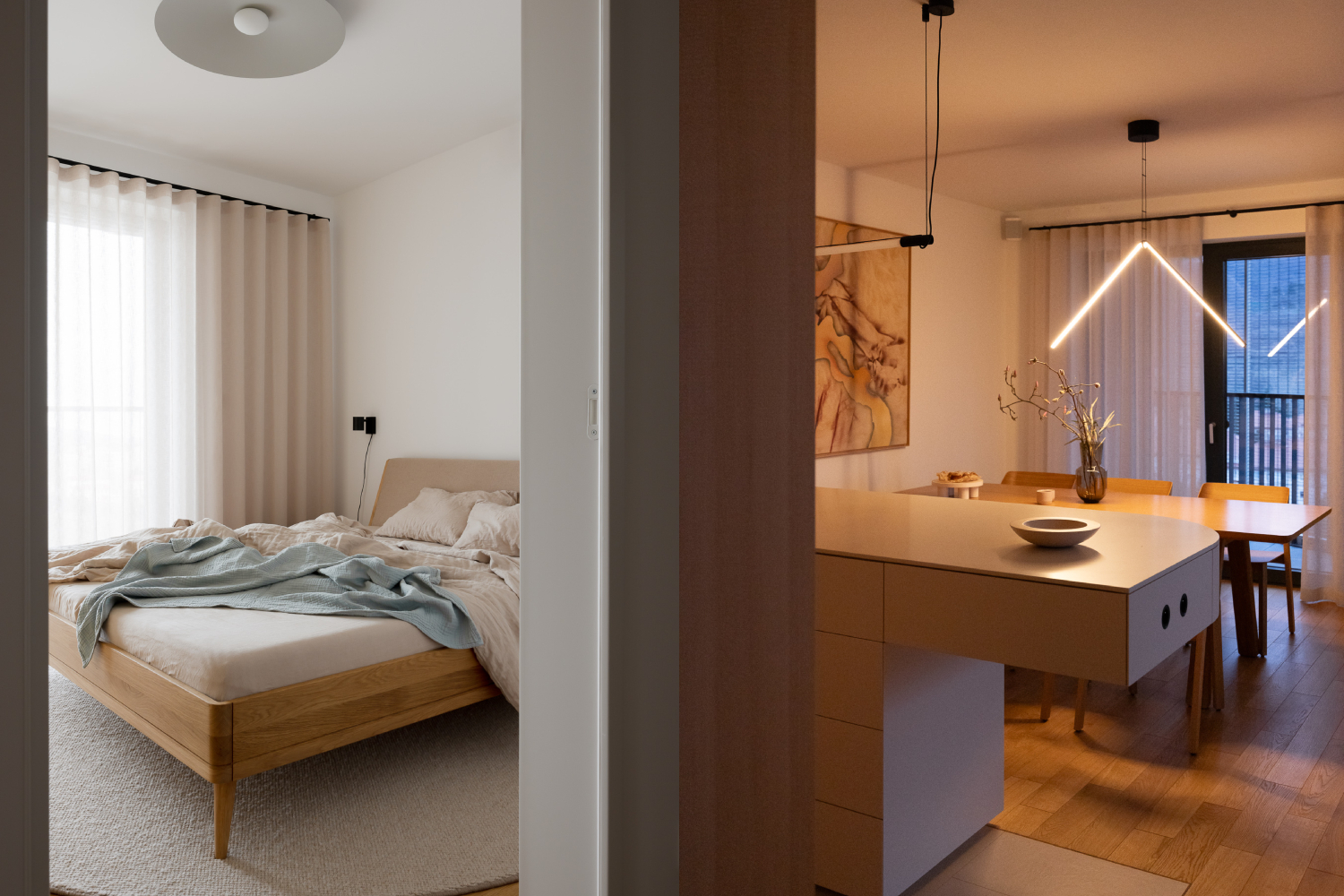 Vrstvenie textílií a teplé osvetlenie. Interiér: Ateliér 27.9. Autorka: Lenka Némethová