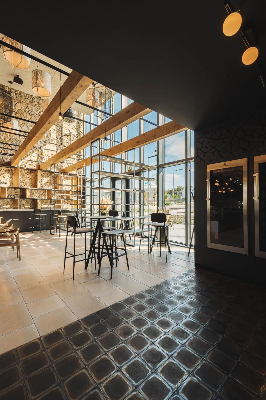 Napriek tomu, že interiér je ladený monochromaticky, resp. jeho jedinými farbami sú farby použitých materiálov, nepôsobí monotónne, práve naopak. Stavil na kontrasty. Či už ide o vizuálne spojenie subtílnych čiernych oceľových alebo železných konštrukcií so svetlými plochami podláh z prírodného kameňa, alebo kontakt drsne pôsobiaceho kamenného obkladu s hladkými povrchmi pultov a jemnými textíliami. Príjemné pôsobenie interiéru podčiarkuje riešenie akustiky, ktorá často ostáva pri podobných priestoroch opomenutá. V tomto prípade ju rieši veľkoplošný podvesený podhľad z prírodných vlákien zasahujúci celú dĺžku priestoru.