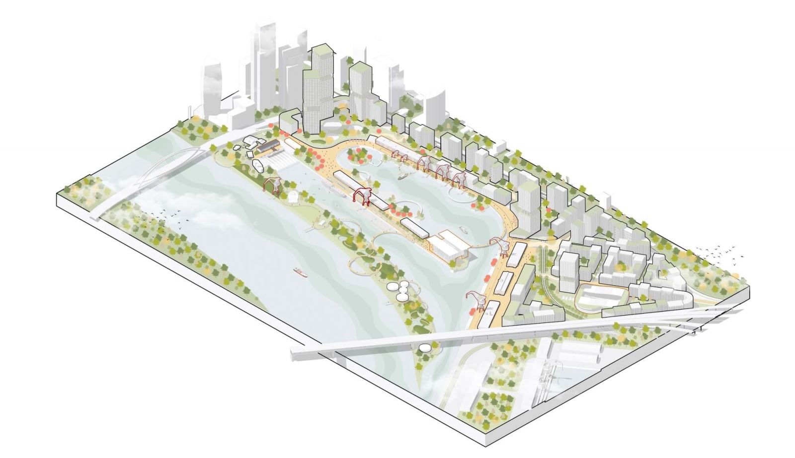Špecifikom je riešenie priestoru najbližšie k Dunaju ako parku, určeného pre podujatia masovejšieho charakteru. Autor vychádzal z dvojice východísk – jednak absencie priestoru pre väčšie kultúrne podujatia pod voľným nebom, ako aj z potreby zachovania protipovodňovej ochrany. Môže tu tak podľa neho vzniknúť akýsi novodobý park kultúry o oddychu.