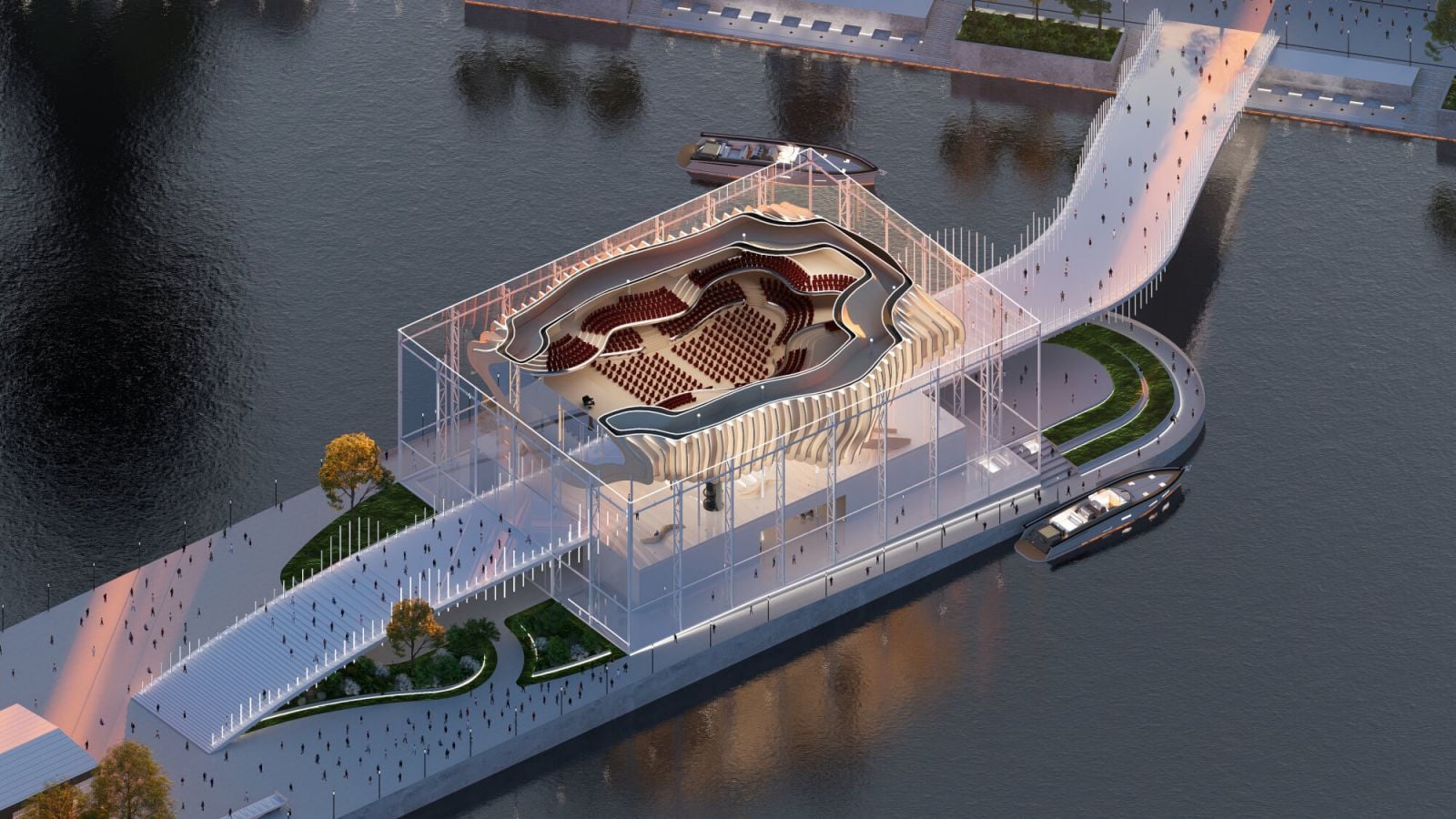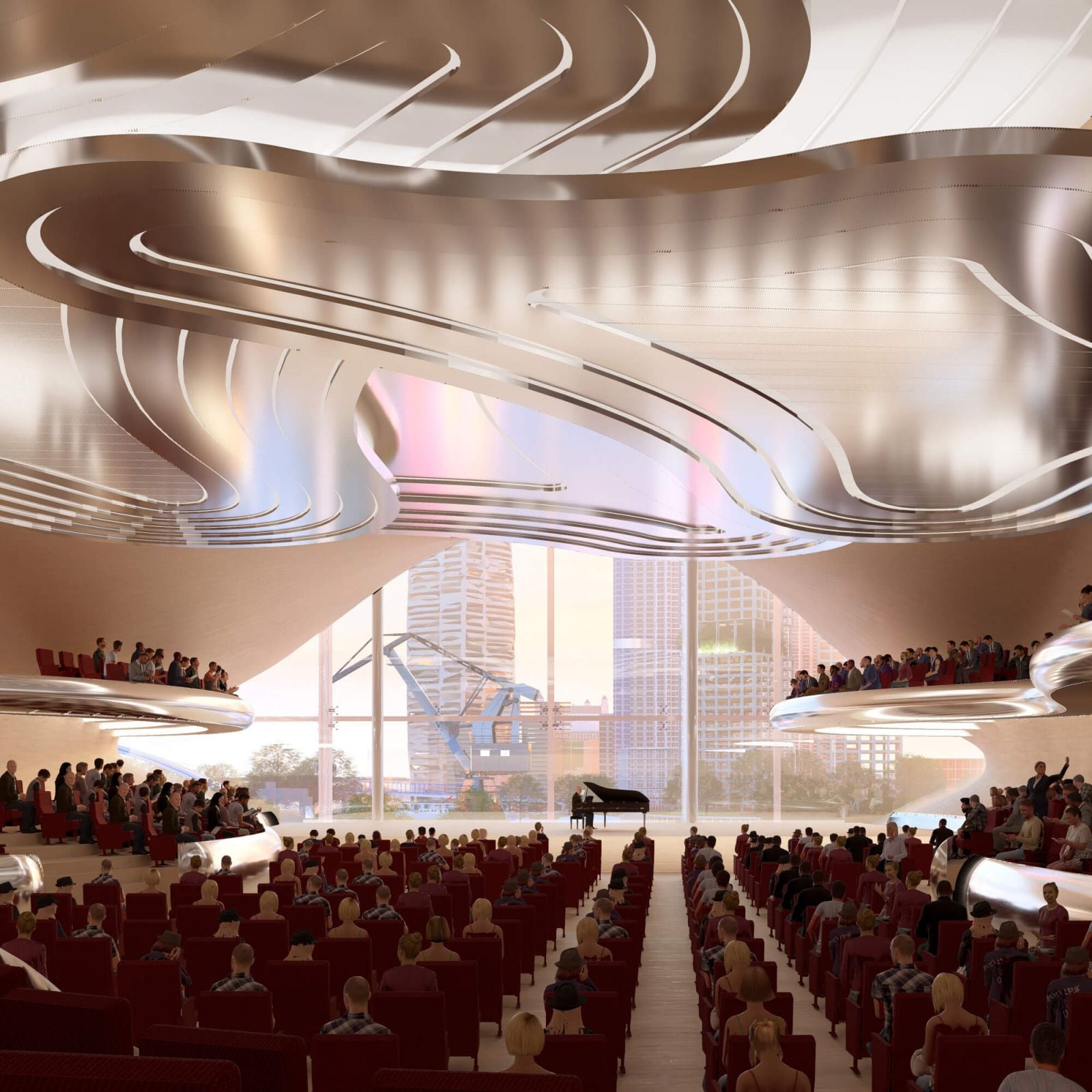 Samotná sála má v tomto prípade kapacitu tisíc divákov. Vznikla z oblastí s najvyššou akustickou intenzitou. Doplnkové časti ako most, vestibuly a foyer boli vytvorené z nižších intenzít. Budova by mala šesť nadzemných podlaží, ktoré zahŕňajú verejné zóny, zázemie, foyer, šatne, skúšobne a hudobnú sálu s balkónom. Verejné prepojenie je zabezpečené z nábrežia aj z budúcej zastávky vodnej MHD, pričom most ponad Dunaj tvorí kľúčové symbolické spojenie hudby, vody a mesta.