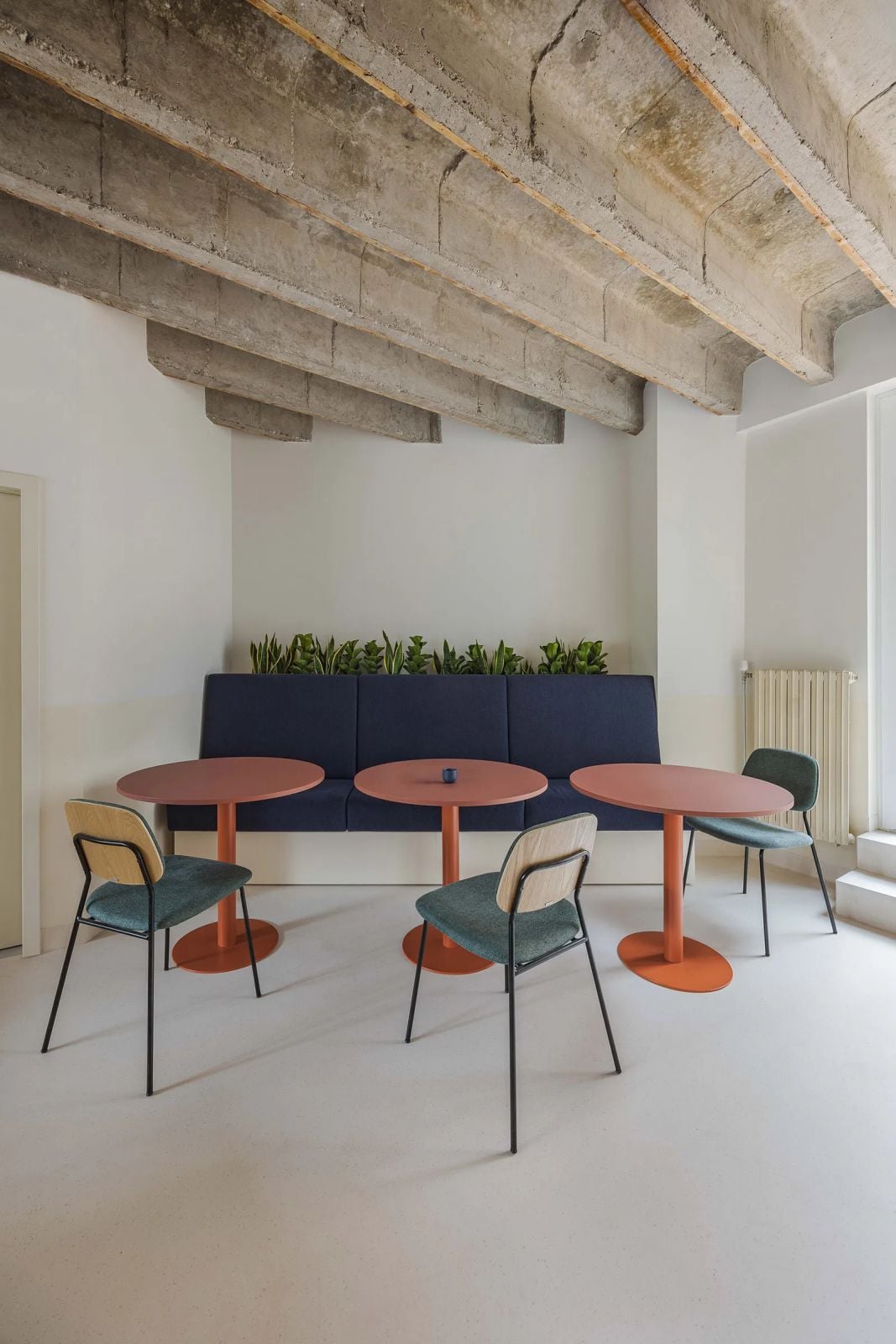 Dôležitou súčasťou návrhu boli tiež farebné akcenty v podobe solitérov, ako sú taburety, konferenčné stolíky, kreslá či dokonca interiérové dvere. Spoločná kuchynka sa naopak nesie v neutrálnej materiálovej palete.