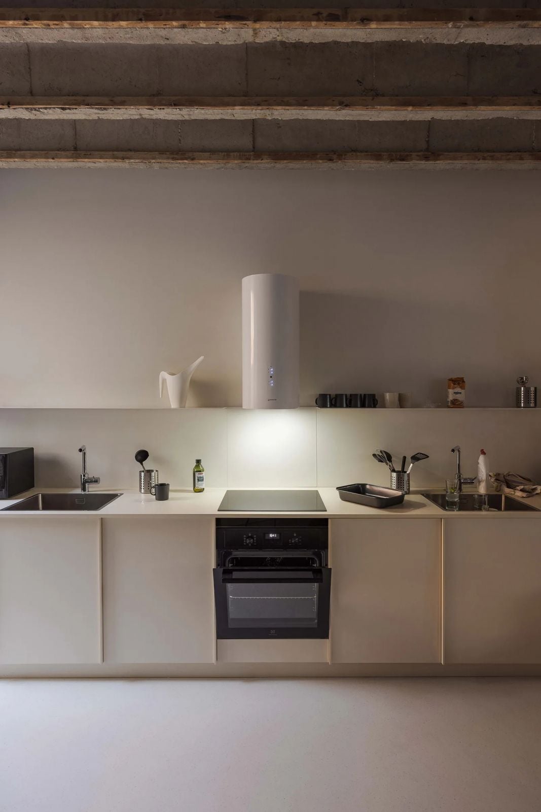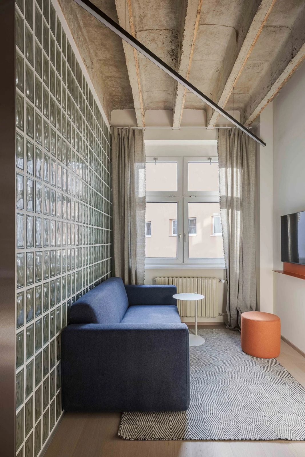 Pôvodný charakter budovy sa do interiéru preniesol najmä cez odhalený betónový rebrový strop, ktorý sa nachádza v spoločenskom priestore i v samostatne fungujúcich izbách. Architekti ďalej experimentovali s na modro natretými okenicami či sklobetónovými tvárnicami. Z materiálov v interiéri nechýba ani dostatok dreva či viaceré béžové odtiene.