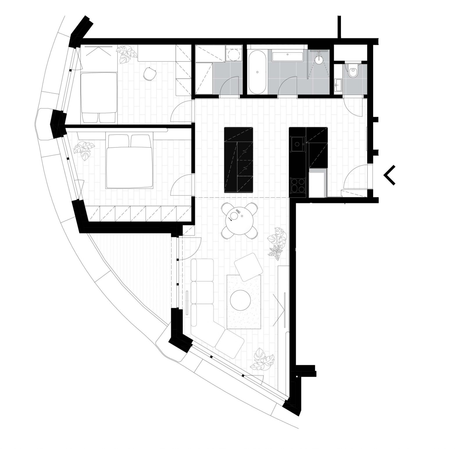 V prípade tohto interiéru je obývacia časť navrhnutá s dôrazom na špecifickú architektúru jednej z veží komplexu Sky Park. Sedacia súprava je v rámci priestoru voľne položená a jej atypické zakrivenie v rohovej časti reflektuje zakrivenie fasády objektu. V tejto časti je možný aj výstup na priľahlý balkón.