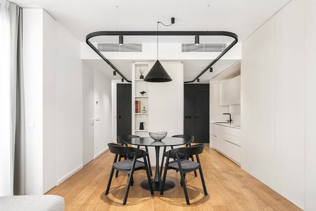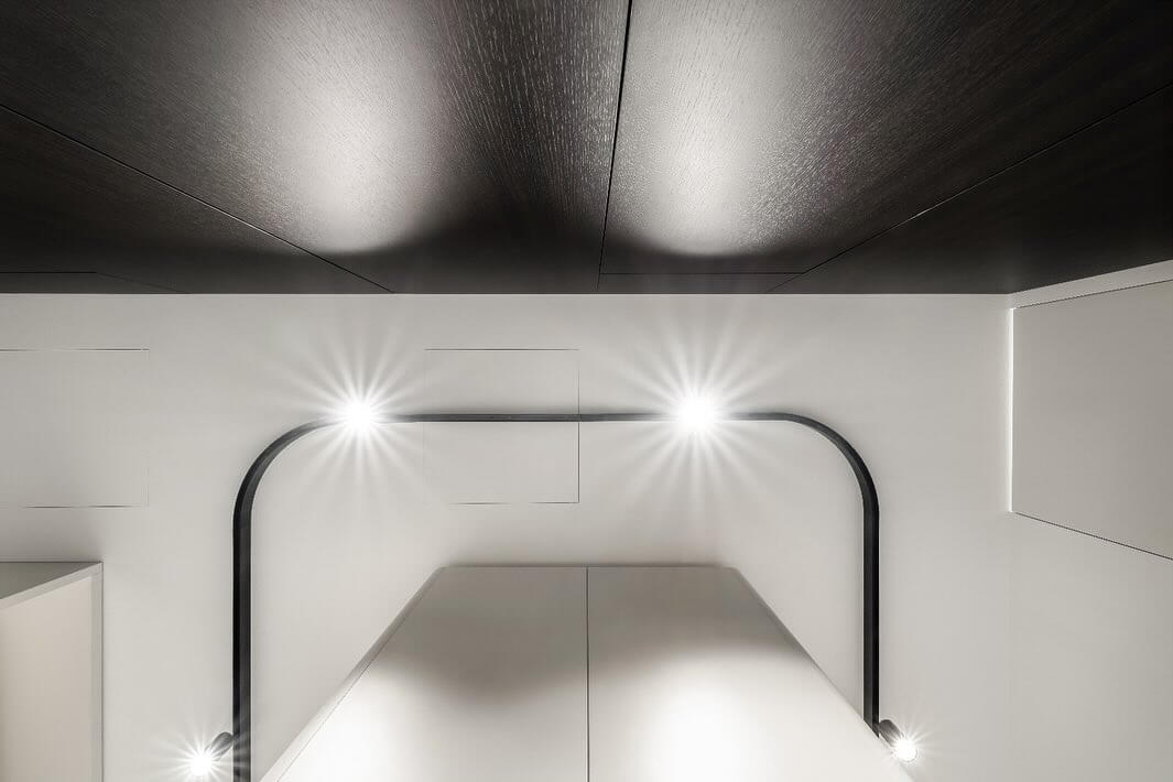 Unikátnosť celého riešenia podčiarkuje navrhnutý svetelný dizajn. Ten je tvorený koľajnicovým systémom so zaoblenými rohovými riešeniami, v rámci ktorého je možné svietidlá umiestniť v podstate akokoľvek. Dôraz na jedálenské sedenie bol vytvorený za pomoci minimalistického závesného svietidla.
