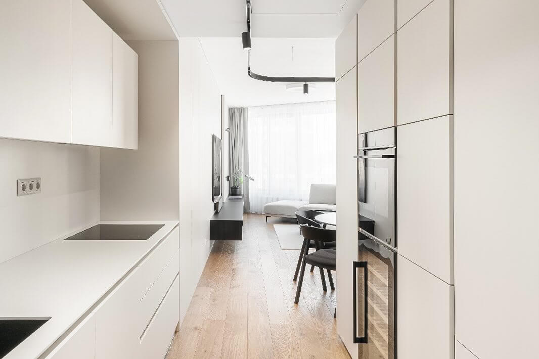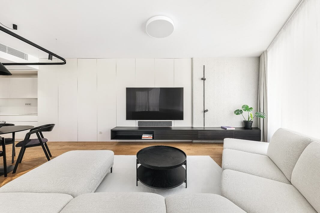 Vo vstupnej hale sa okrem úložných priestorov nachádza tiež zrkadlo či taburet. Úložné priestory prislúchajúce k vstupnej hale následne plynule prechádzajú do kuchynskej linky svetlošedej farby. Na tú v obývacej izbe nadviazal minimalistický stenový obklad, ktorý tvorí podklad pre TV stenu. Tá sa rovnako vyznačuje minimalistickým dizajnom a pozostáva z horizontálnej TV skrinky tmavošedej farby.