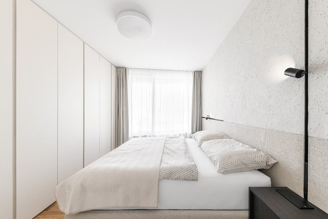 V rovnakom materiálovom a dizajnovom duchu sa nesie aj nočná časť bytu. Svetlá paleta materiálov opticky zväčšuje napríklad hlavnú spálňu. Tu okrem praktickej čalúnenej postele nájdeme tiež na mieru navrhnuté úložné moduly a minimalistické nočné stolíky v tmavej farbe. K celkovej príjemnej atmosfére prispievajú textílie v podobe závesov a záclon.