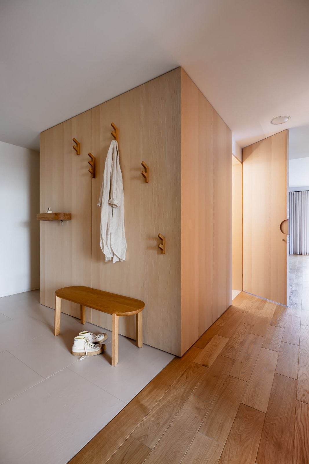 Pri vstupe do bytu zaujme v prvom rade veľkoformátový obklad stien. Časť vyhradená na vešanie, ktorá plynule prechádza za roh až k hosťovskému WC, bola obložená dreveným obkladom. Opačná stena bola obložená sériou zrkadiel, ktoré opticky zväčšujú priestor a plynule prechádzajú za roh smerom k jednej z izieb. Vo vstupnej hale ďalej nájdeme tiež sériu vešiakov doplnenú o voľne stojaci taburet. Potrebný úložný priestor sa nachádza v opticky oddelenom šatníku.