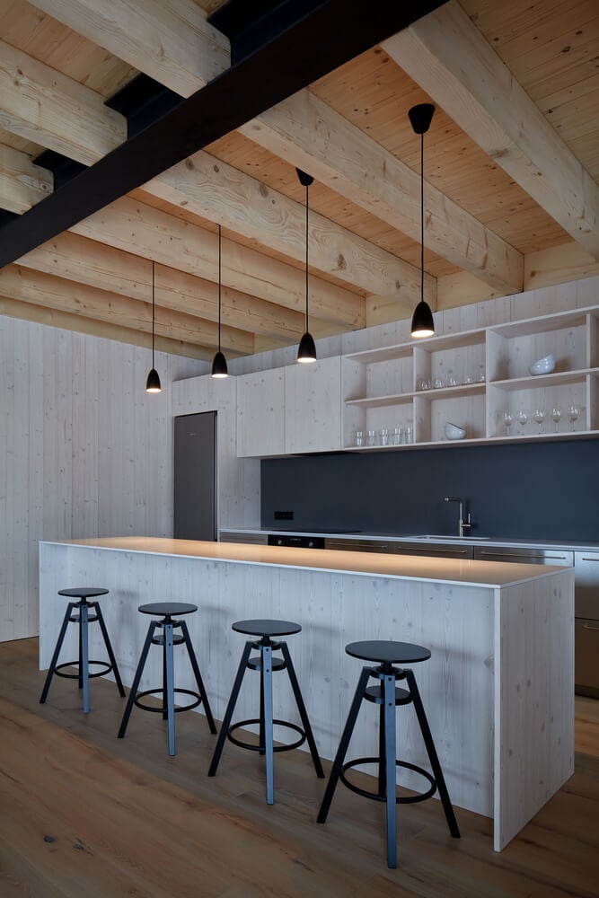 Z materiálov v tejto časti chaty prevláda svetlé smrekové drevo, biela omietka a betón v podobe stĺpu oddeľujúceho obytnú časť od jedálne. Detaily v podobe svietidiel či solitérnych prvkov boli vybrané v čiernej farbe, vďaka čomu interiér nepôsobí jednoliato. Vo veľkej časti spodného podlažia bola navrhnutá drevená podlaha. Tento materiál ostal priznaný aj v podobe stropných trámov.