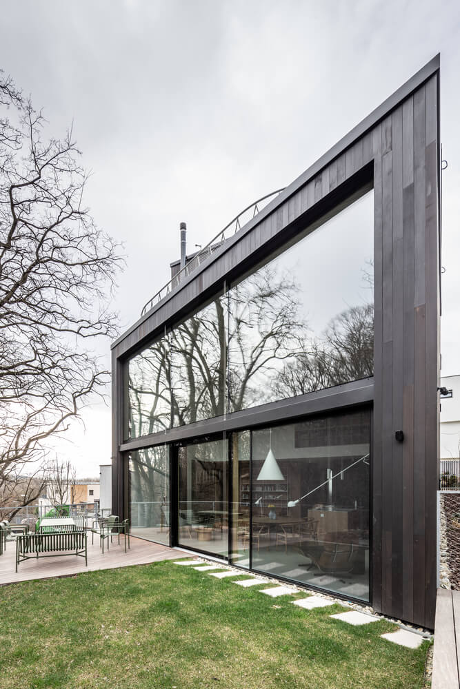 Po oceľovom schodisku sa dá dostať až na strechu, ktorá obyvateľom poskytuje dodatočné odpočinkové plochy s ničím nerušeným výhľadom na krásne okolie. Poloha a veľkosť okenných otvorov v celom objekte boli navrhnuté s ohľadom na tento zámer. K domu navyše prislúcha niekoľko cenných exteriérových priestorov, ako sú terasy, menší bazén, saunovací domček či tieniaca pergola pre tri autá. Zaujímavosťou je, že klient si renomovaného architekta povolal aj na riešenie krajinnej architektúry - jej dizajn pripravil Eugen Guldan.