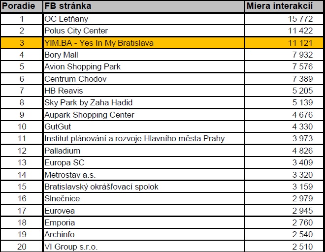 Na základe výpočtu miery interakcie, pozostávajúcej zo sumáru komentárov, likeov a zdieľaní v sledovanom období (1Q 2019) vyplýva, že YIM.BA je tretia, ďaleko pred porovnateľnými stránkami či médiami. Na prvom, druhom aj štvrtom až šiestom mieste sú stránky nákupných centier s aktívnym marketingom a ponukou produktov či zliav, čo zvyšuje ich mieru interakcie.