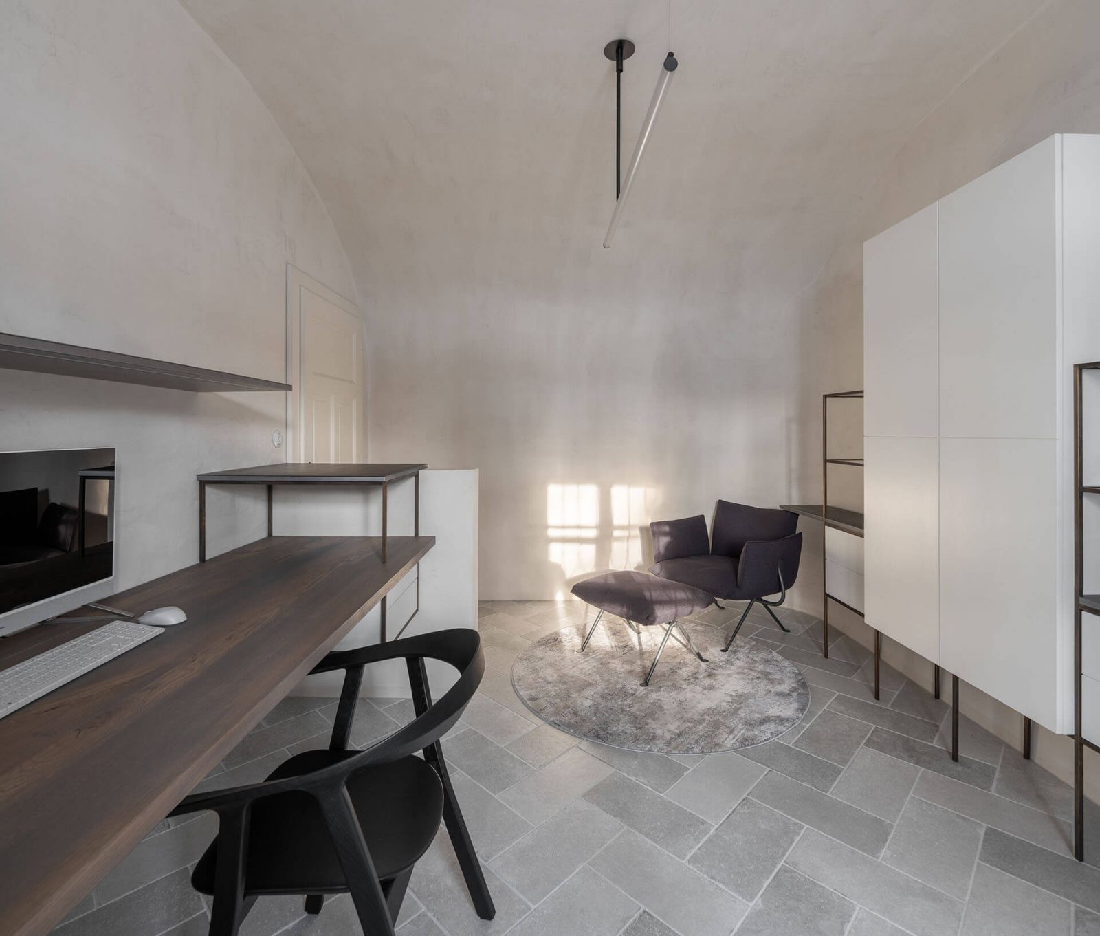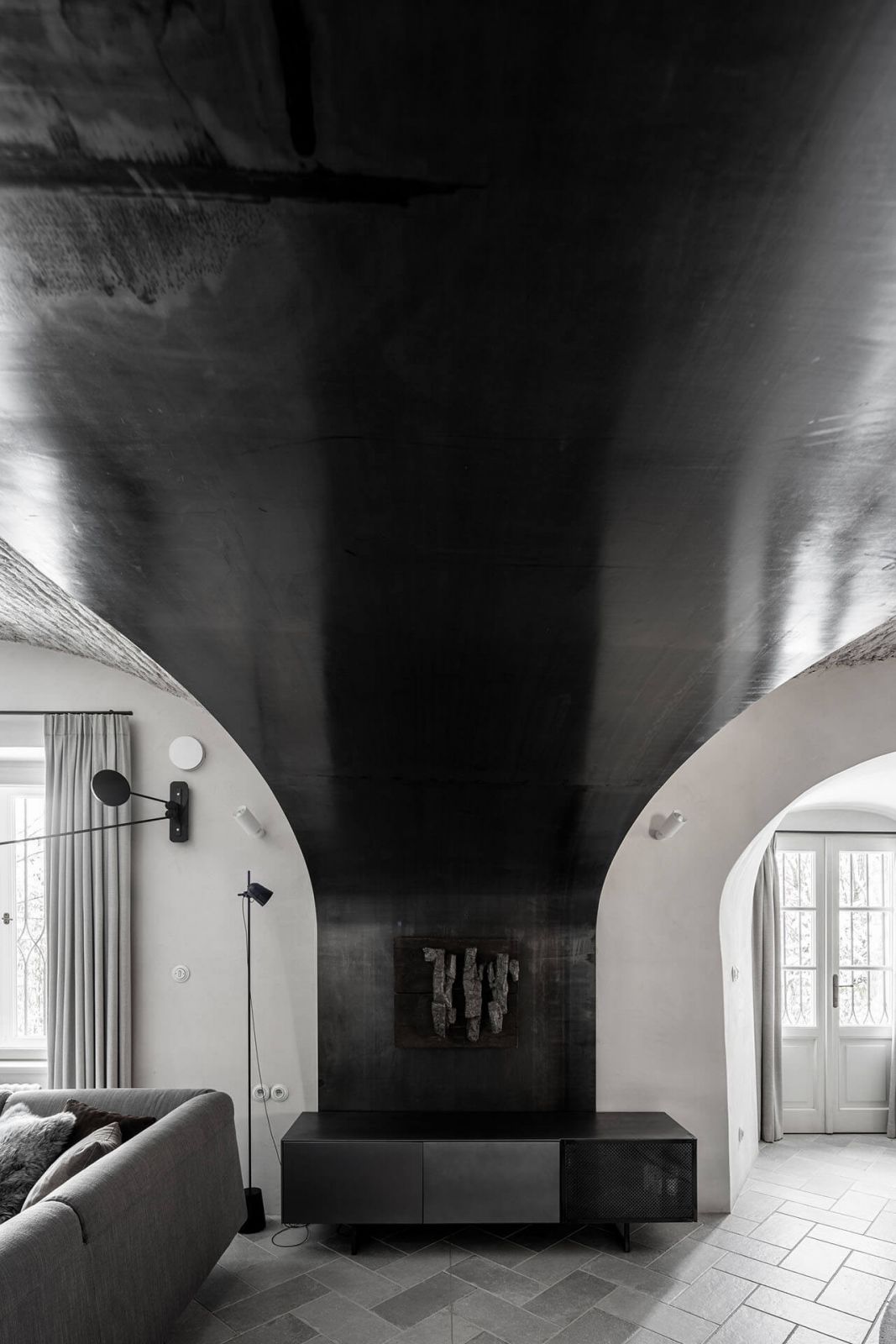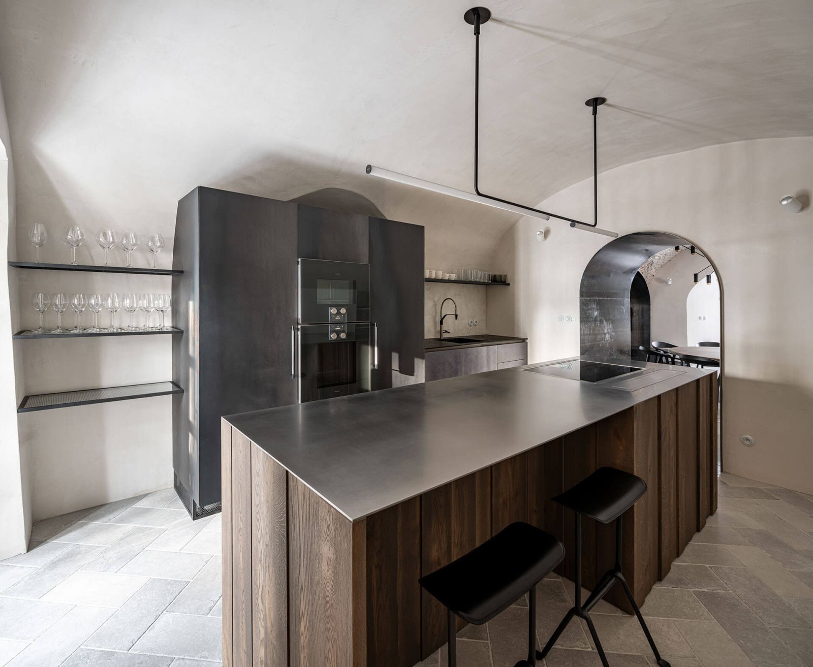 „Klenby boli prvok, ktorý nás zaujal hneď pri prvej návšteve. Bolo to tesne pred omietnutím a to by bola škoda. Ponechanie klenieb dodalo priestoru dramatickosť a zvýraznilo historický odkaz,“ opisujú architekti. Zároveň dodávajú, že klenby boli spevnené pomocou helikálnych výstuží. Potrebné vývody na svetlá boli prevedené z horného podlažia, vďaka čomu sa klenby zachovali vizuálne kompaktné.