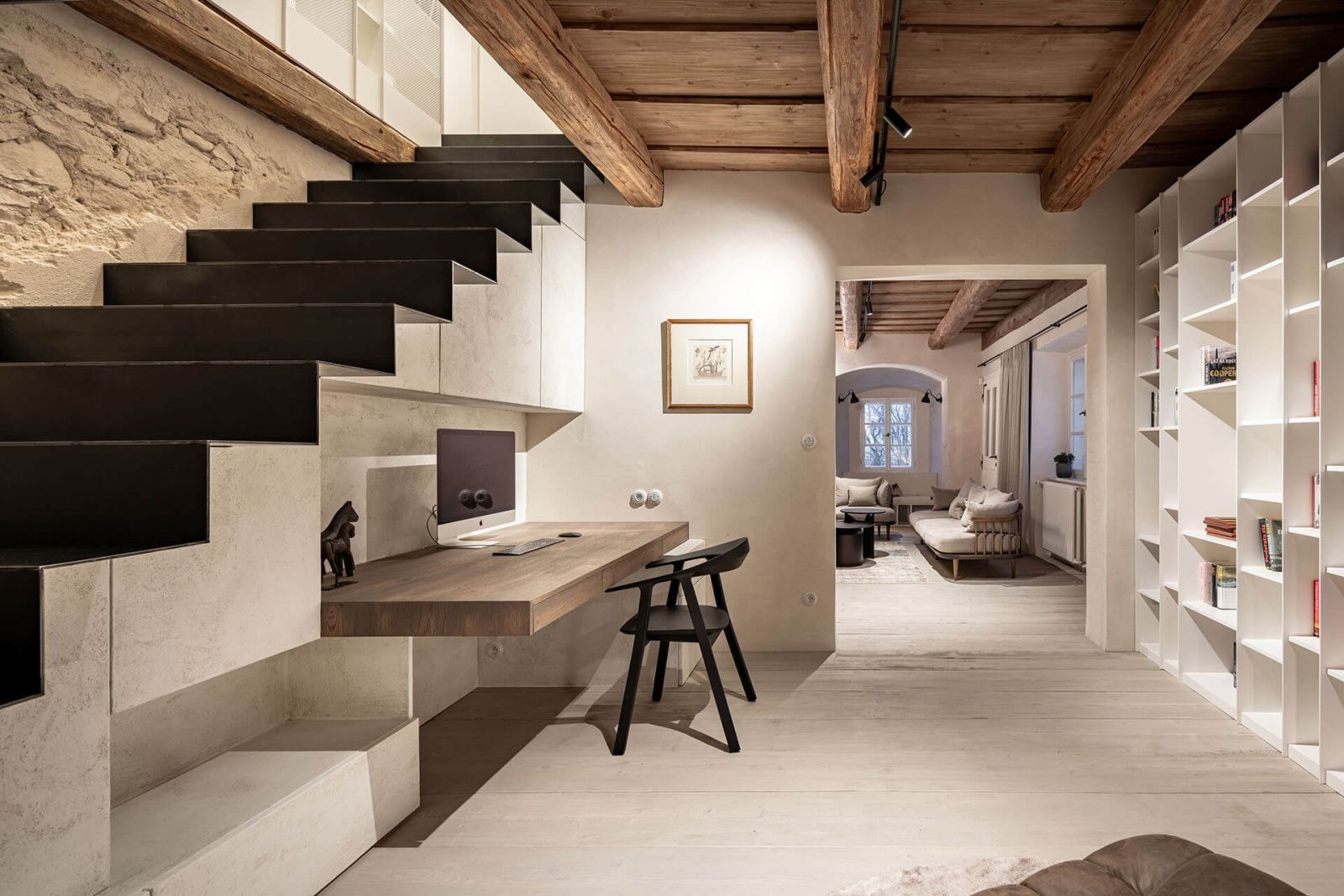 Jedinečným detailom je tiež schodiskový priestor. Stupne z tmavého dreva sú tu doplnené o čiastočne odhalené tehlové murivo po stranách a zachovaný drevený strop. K unikátnej atmosfére prispieva aj LED podsvietenie madiel a zvolené závesné svietidlo. Po výstupe na horné podlažie začínajú priestory dýchať omnoho domáckejšou atmosférou. Dôvodov na to je hneď niekoľko. V celom rozsahu tu bol zachovaný existujúci drevený strop, omietky a veľká časť nábytku bola navrhnutá v svetlých tónoch a nechýbajú ani drevené detaily či príjemne pôsobiace béžové textílie.