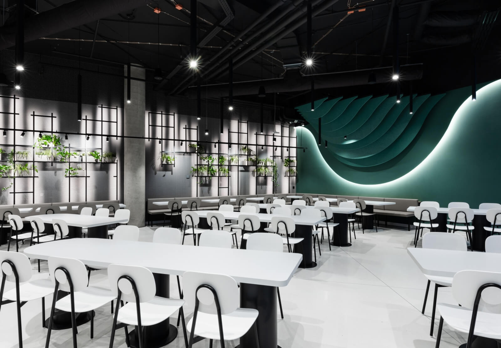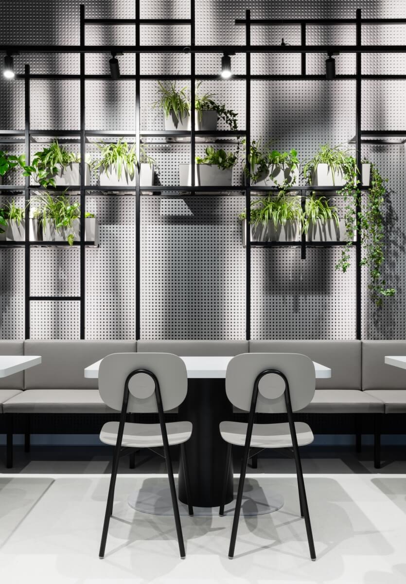 Jedálenské stoličky a stoly boli v tomto prípade navrhnuté v rovnakom štýle a v neutrálnej bielo-čiernej kombinácii. „Každý si môže vybrať, či tu strávi viac času a pohodlne sa usadí do nízkeho sedenia, alebo spolu s kolegami počas obeda obsadí polovysoké stoličky okolo veľkého stola,“ upresňujú architekti.
