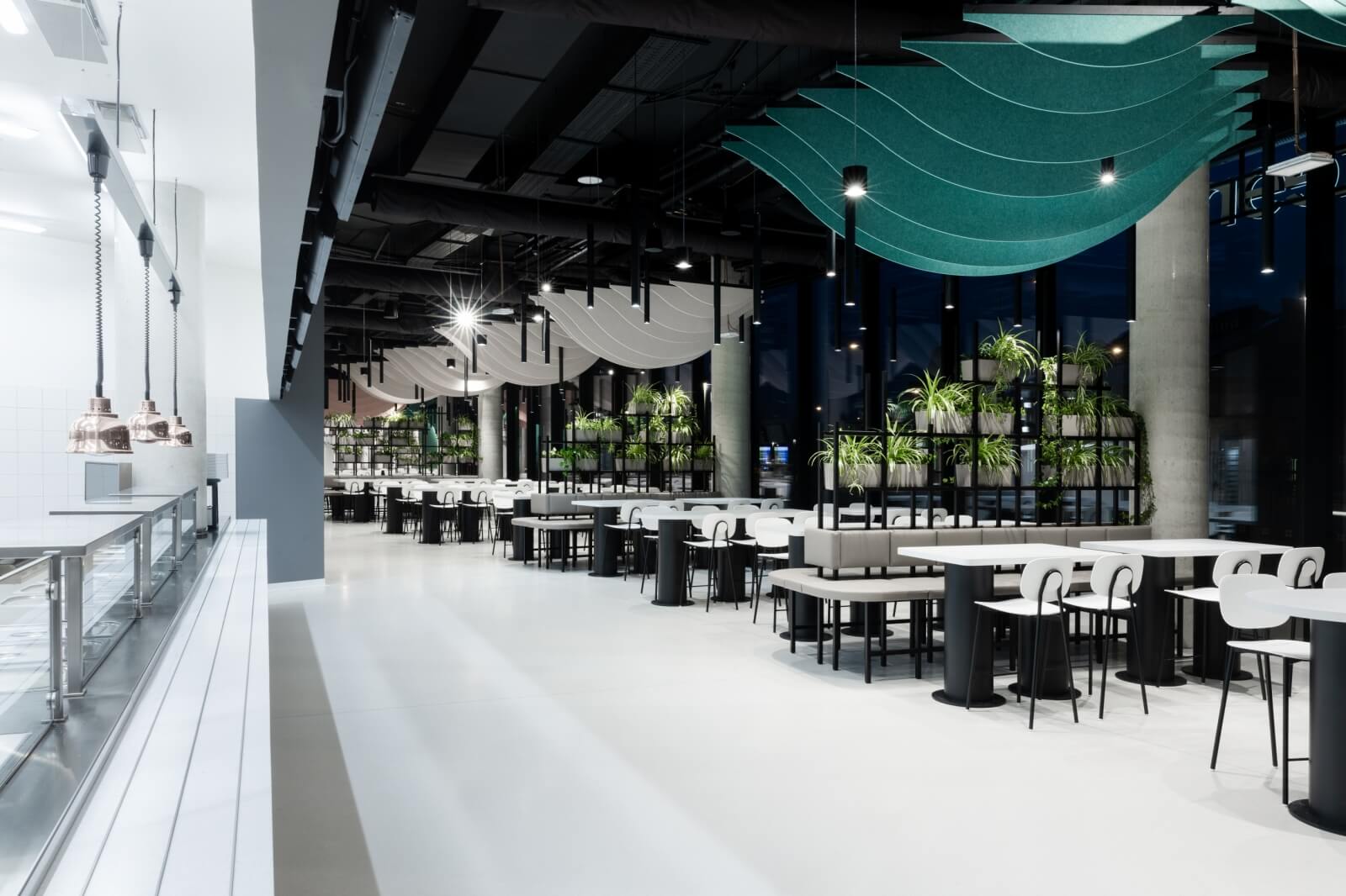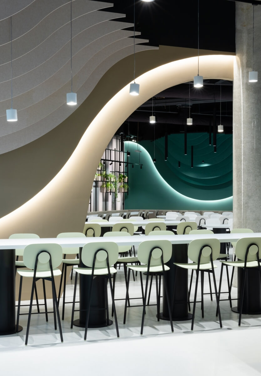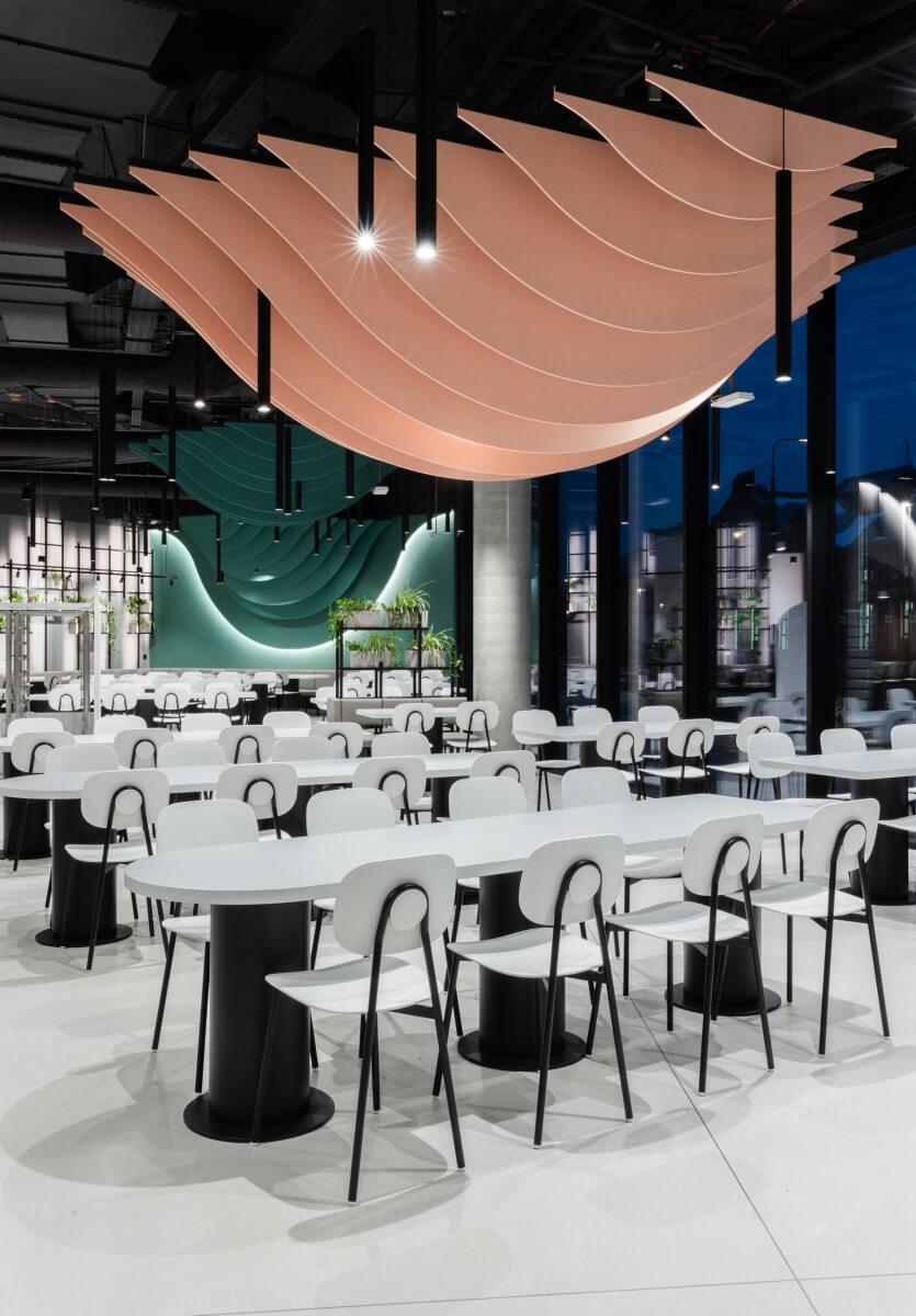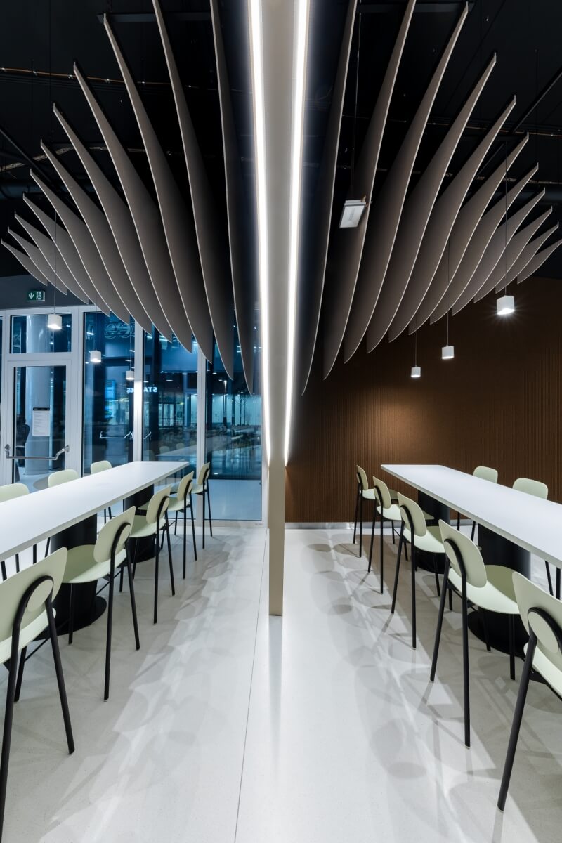 V interiéri hlavnej kantíny sa tvorcom interiéru vďaka niekoľkým funkčným aj dizajnovým prvkom podarilo nadviazať na architektúru celého objektu. „Tvar budovy spĺňa potrebné nároky na priestor a my sme ho podporili našimi riešeniami,“ tvrdia.
