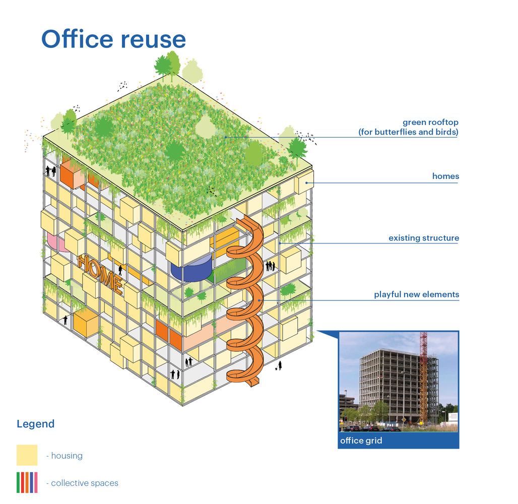 Do existujúcej skeletovej konštrukcie tradičných kancelárskych budov architekti vložili obytné bunky rôznych typológií a kolektívne priestory, vrátane co-workingových kancelárií a zelených plôch. Na prvý pohľad nereálny projekt bol inšpirovaný rastúcim portfóliom spoločnosti HUB, ktorá má na svojom konte už niekoľko podobných konverzií bývalých kancelárskych budov.