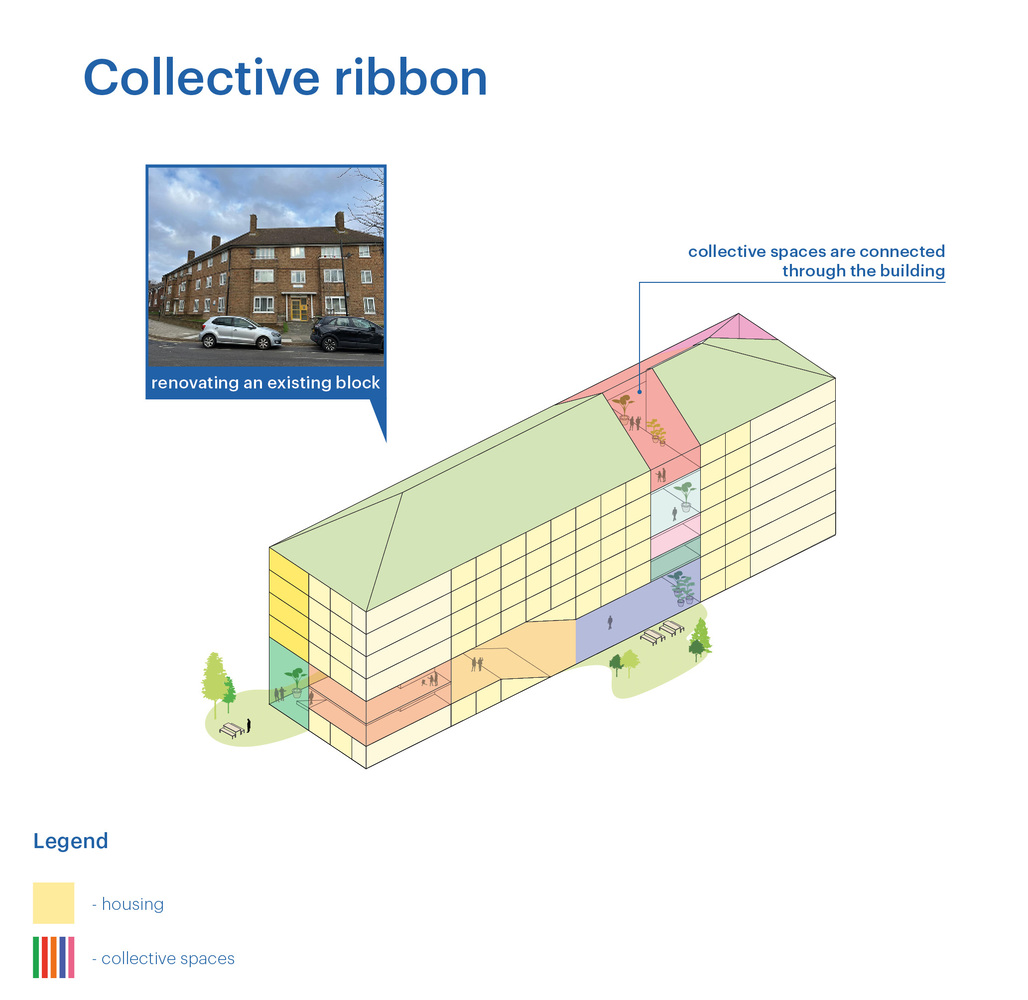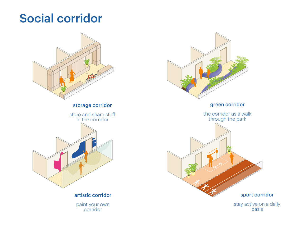 Architekti zároveň predstavili aj menej invazívne návrhy, podporujúce komunitné bývanie. Sociálne koridory by podľa nich mohli vznikať v predimenzovaných priestoroch chodieb či iných vnútorných komunikáciách, prípadne vybudovaním takzvaných predsadených fasád v priamej nadväznosti na už existujúce budovy.