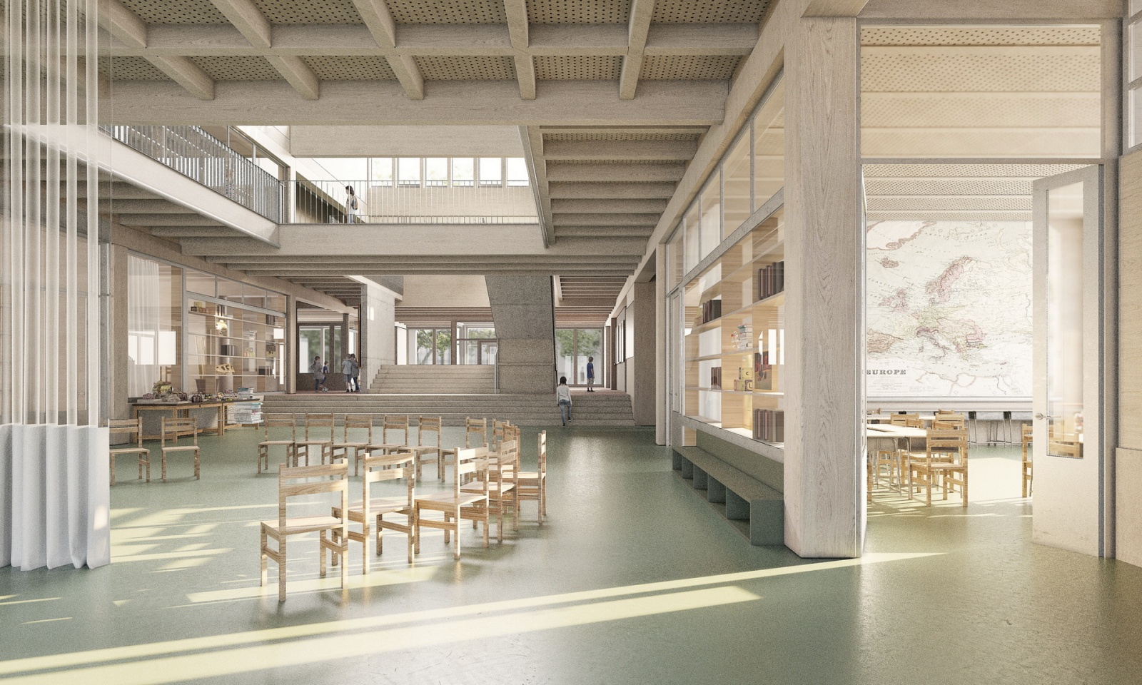 Predstavené vizualizácie načrtli aj riešenie interiérov. V tejto chvíli to vyzerá tak, že vo vnútorných priestoroch budú prevládať svetlé odtiene v kombinácii s bieleným dubom. Vďaka zvolenému riešeniu fasád budú vnútorné priestory navyše dostatočne presvetlené.