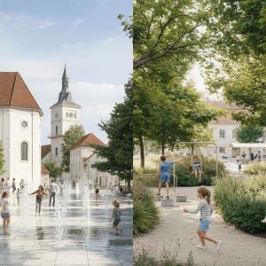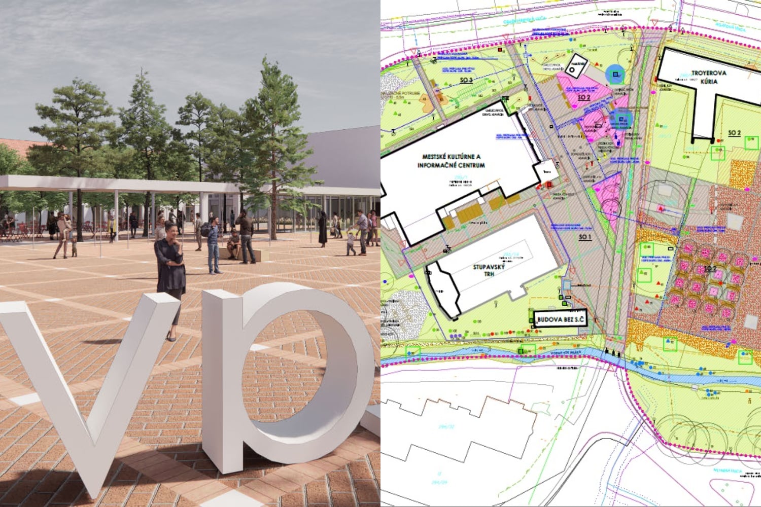Vľavo pôvodný návrh, vpravo súčasný. Zdroj: young.s.architekti, Rudbeckia / Mesto Stupava