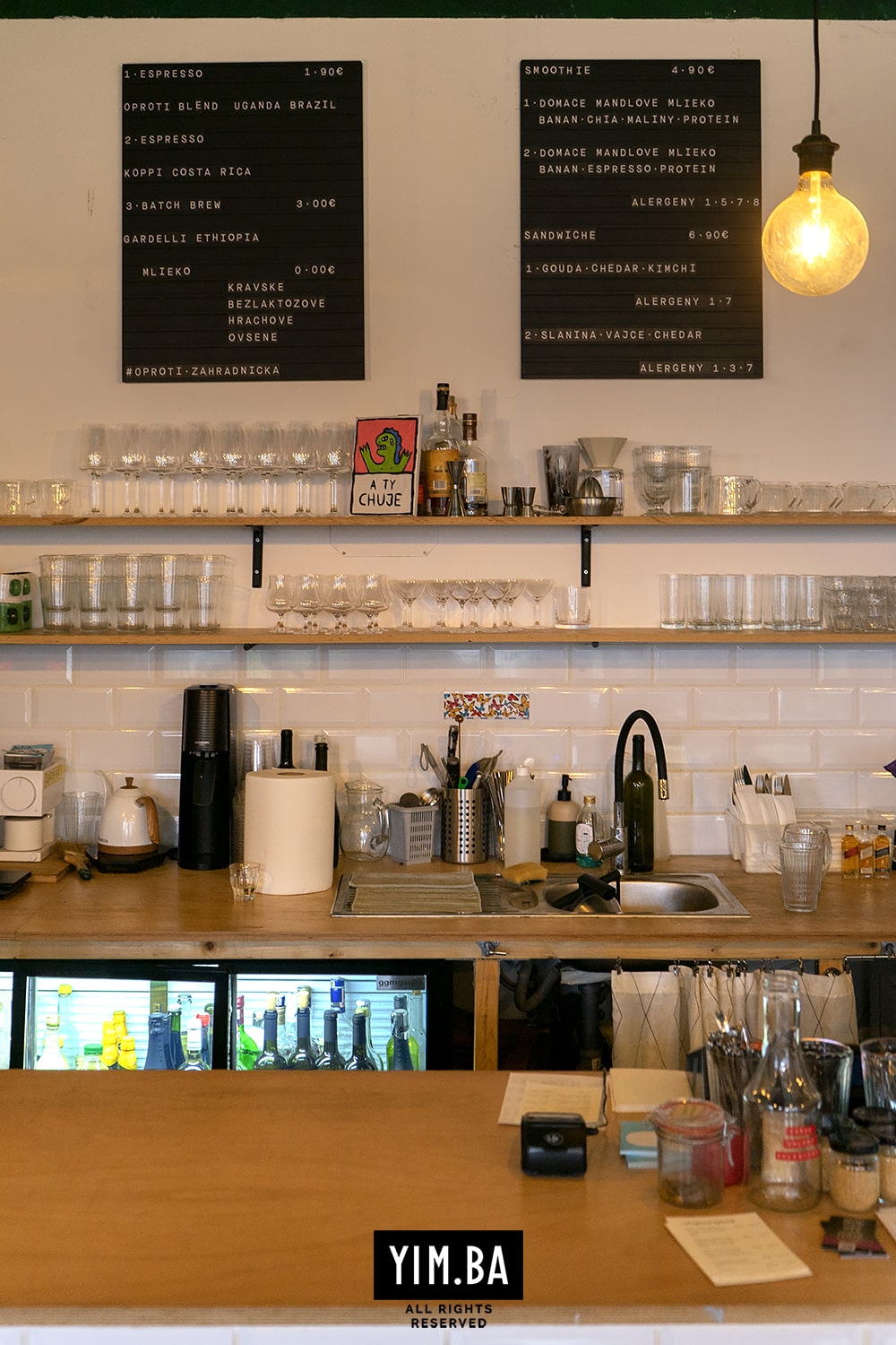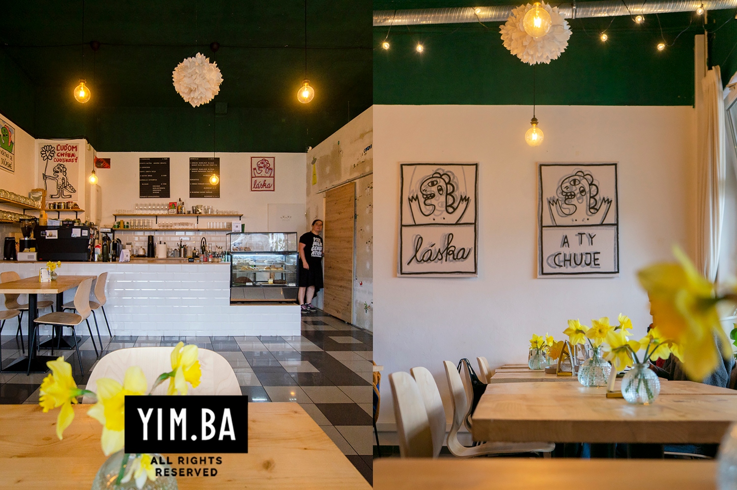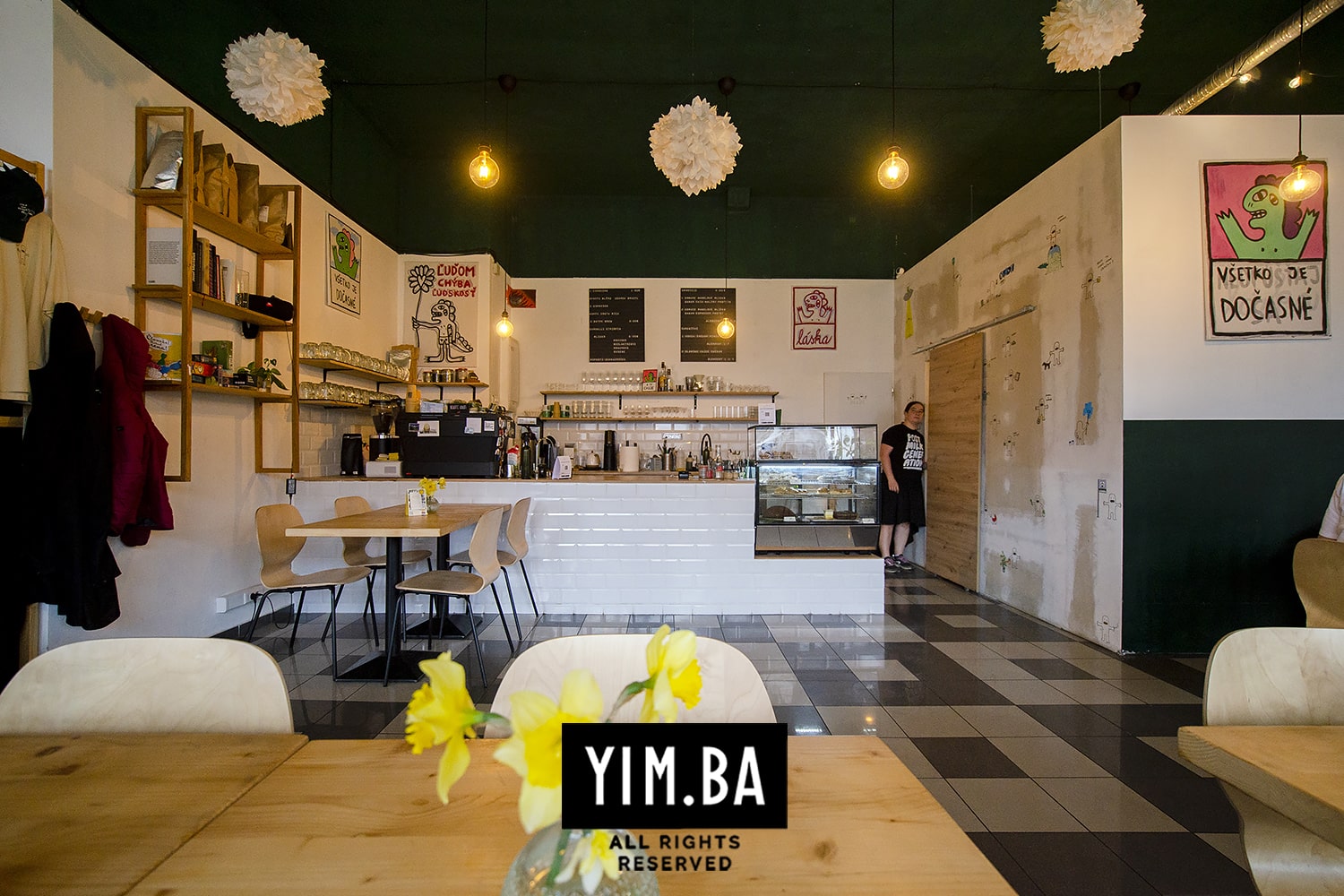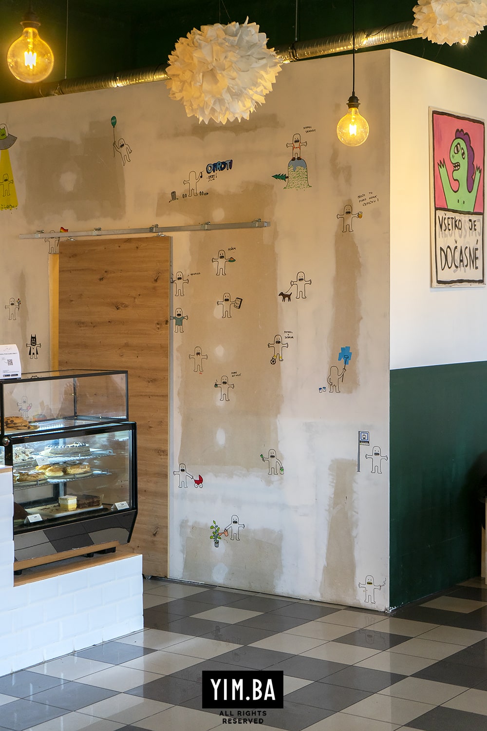 Členenie priestoru pomocou výrazného kontrastu čiernej a bielej, rovnako ako zapamätateľné obrazy od známeho bratislavského street-artového umelca, v konečnom dôsledku vytvorili príjemný podnik so špecifickou identitou. Interiér je odrazom vízie majiteľa aj povahy kaviarne, zameranej na prínos v oblasti kávy a gastra.