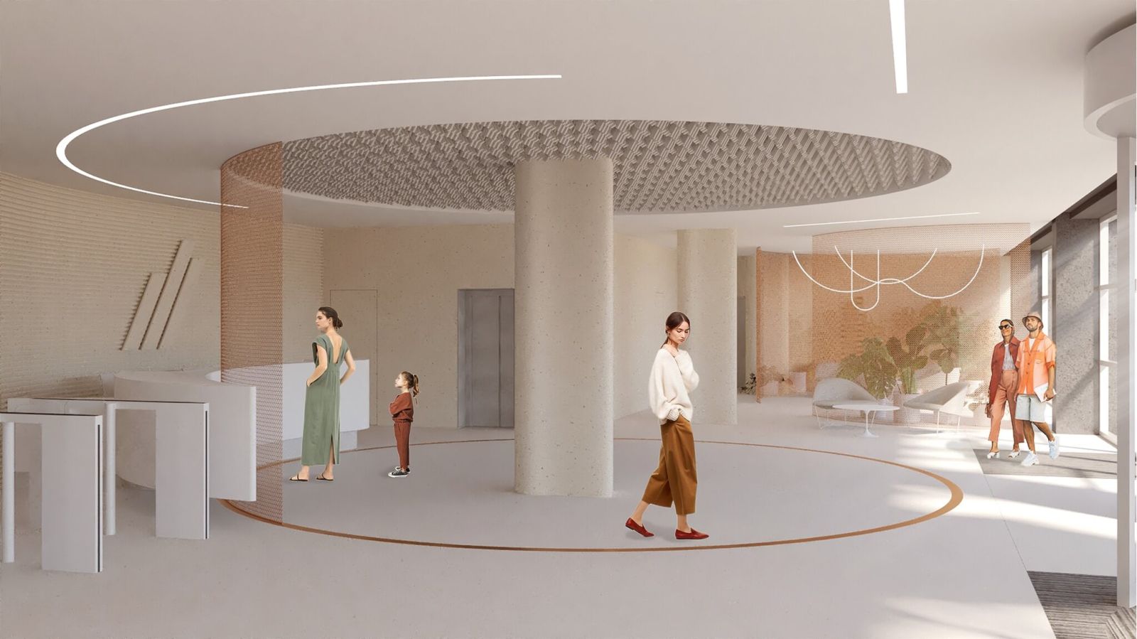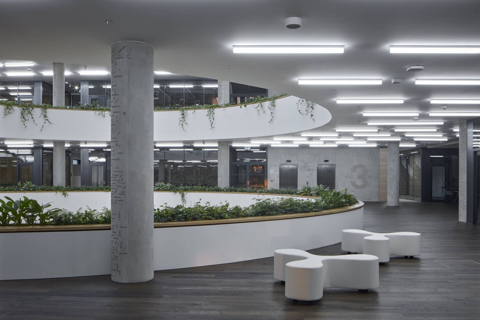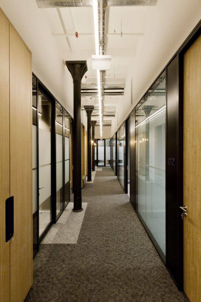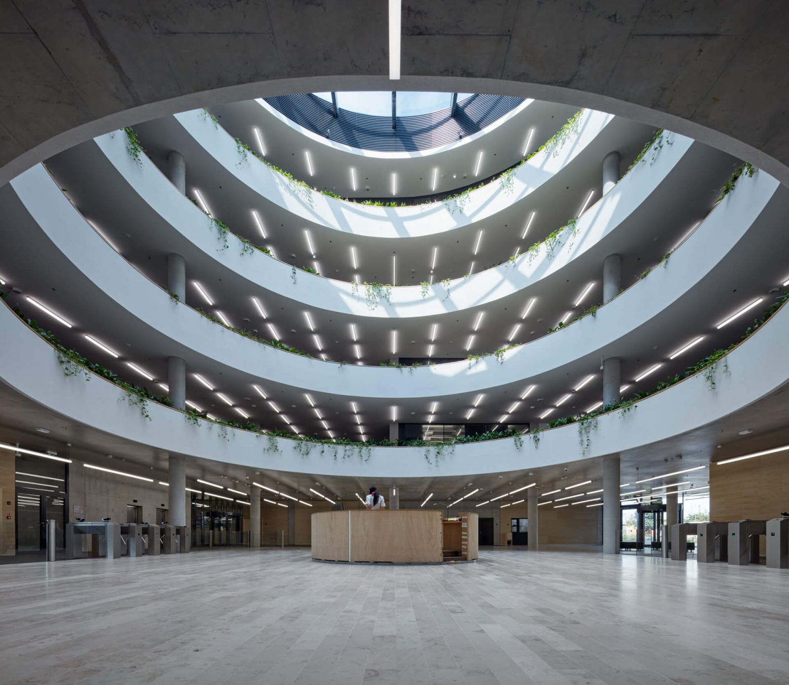 Impozantná však nie je len samotná budova, ale aj jej interiér. Po vstupe do objektu sa návštevníkom naskytne pohľad na otvorené kruhové átrium, ktoré sa tiahne celou výškou budovy. Átrium prináša do vnútorných priestorov dostatok denného svetla a slúži aj ako základný orientačný bod. Jednotlivé kancelárie sú prístupné z rozsiahlych chodieb, situovaných v priamej nadväznosti na centrálny priestor.
