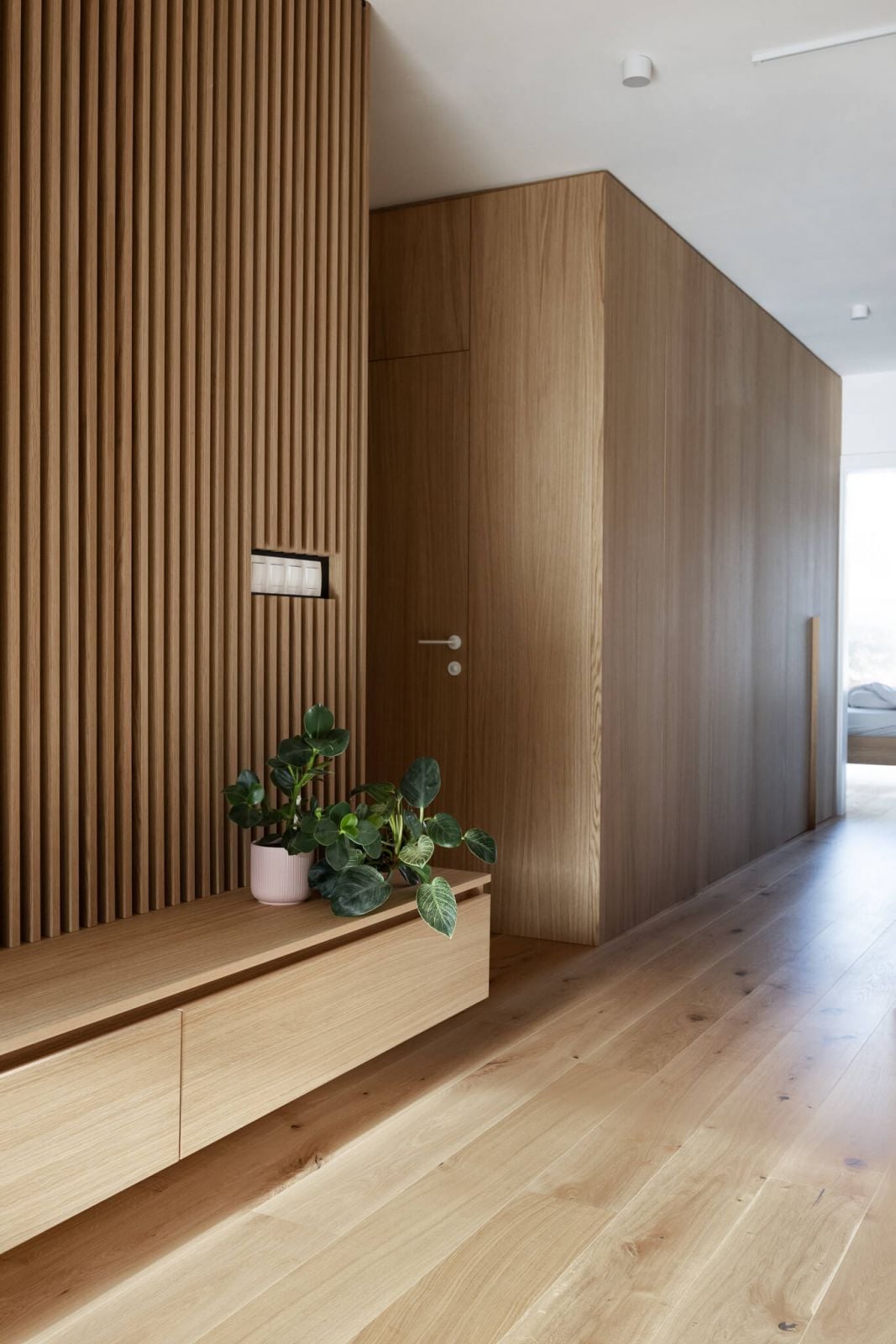 Daný zámer sa odrazil predovšetkým v kombinácii rozsiahleho nábytku na mieru a rozumne vybraných voľne stojacich bytových prvkov. Nábytok na mieru zaberá takmer celú vstupnú halu a v podobe obkladov stien prechádza aj do chodby. K presvetleniu priestoru v tejto časti bytu napomáha rozsiahla zrkadlová stena.