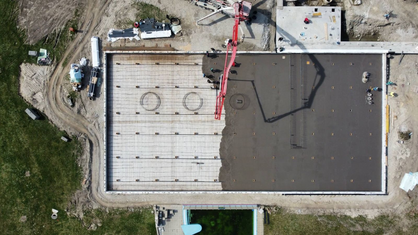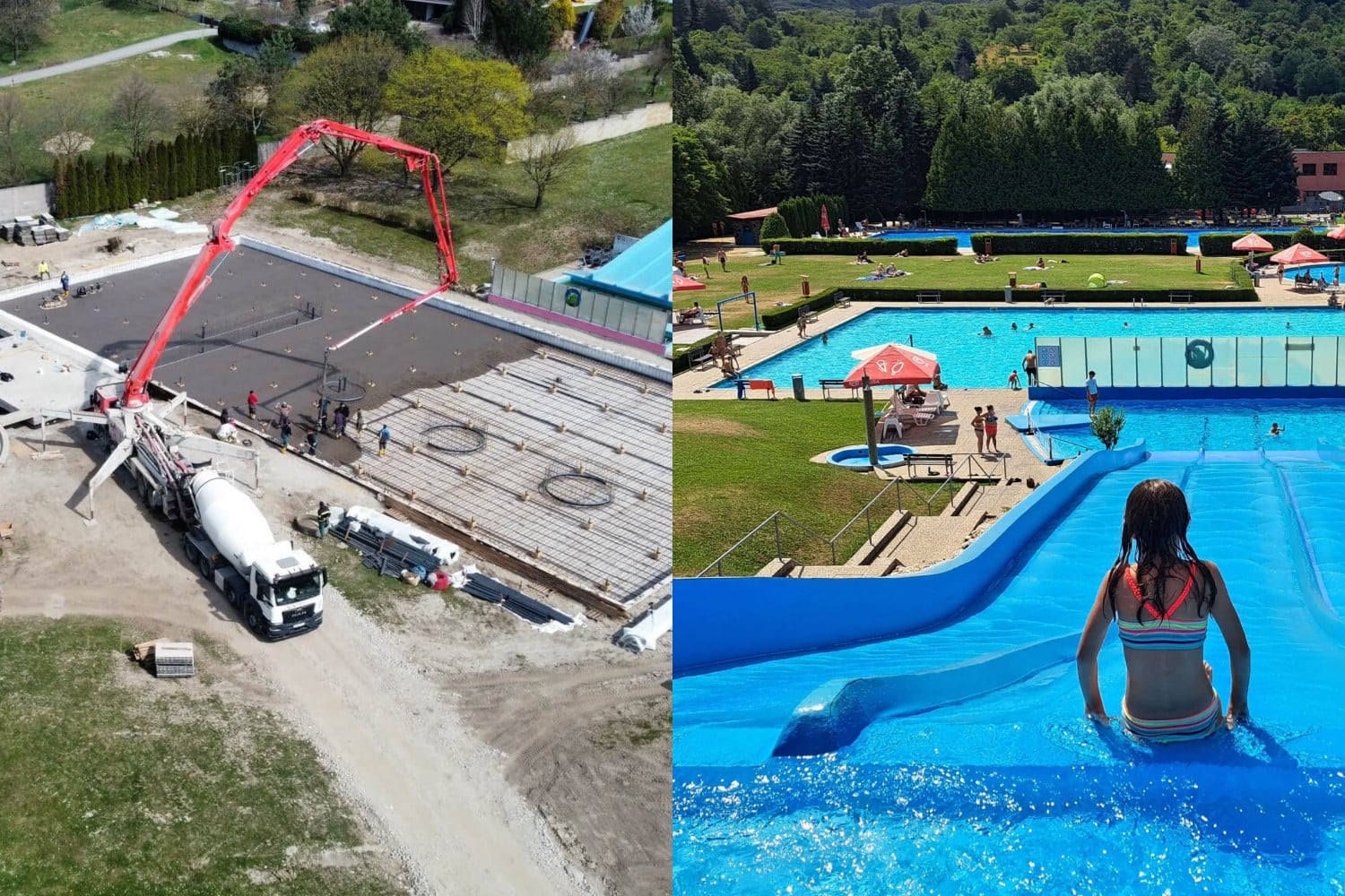 Jedným z najnáročnejších momentov bola samotná megabetonáž dna bazéna, ktorá sa realizovala na ploche viac ako 1.250 m², pri objeme približne 380 m³ betónu a hrúbke 30 cm. Práce prebiehali v jednom celku od 6:00 do 16:00, aby vznikol kompaktný monolit bez spojov, čím sa minimalizuje riziko praskania a zvyšuje životnosť konštrukcie. Nové dno bazéna váži približne 950 ton.
