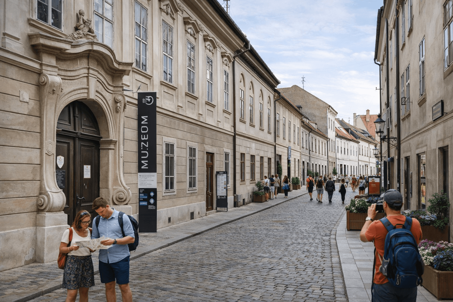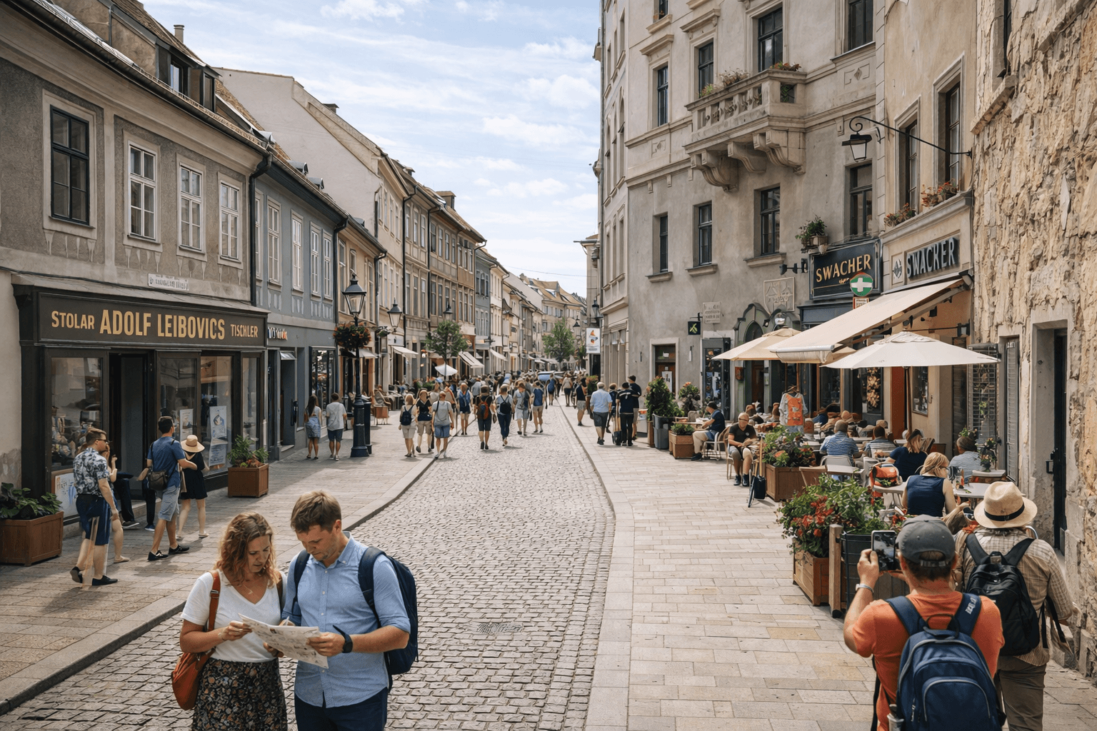 Židovská ulica, pohľad od severu. Jedna z budov vpravo, Zsigrayova kúria, sa zachovala. Dnešný pohľad. Zdroj: Stará Bratislava na fotografiách a obrazoch / YIM.BA