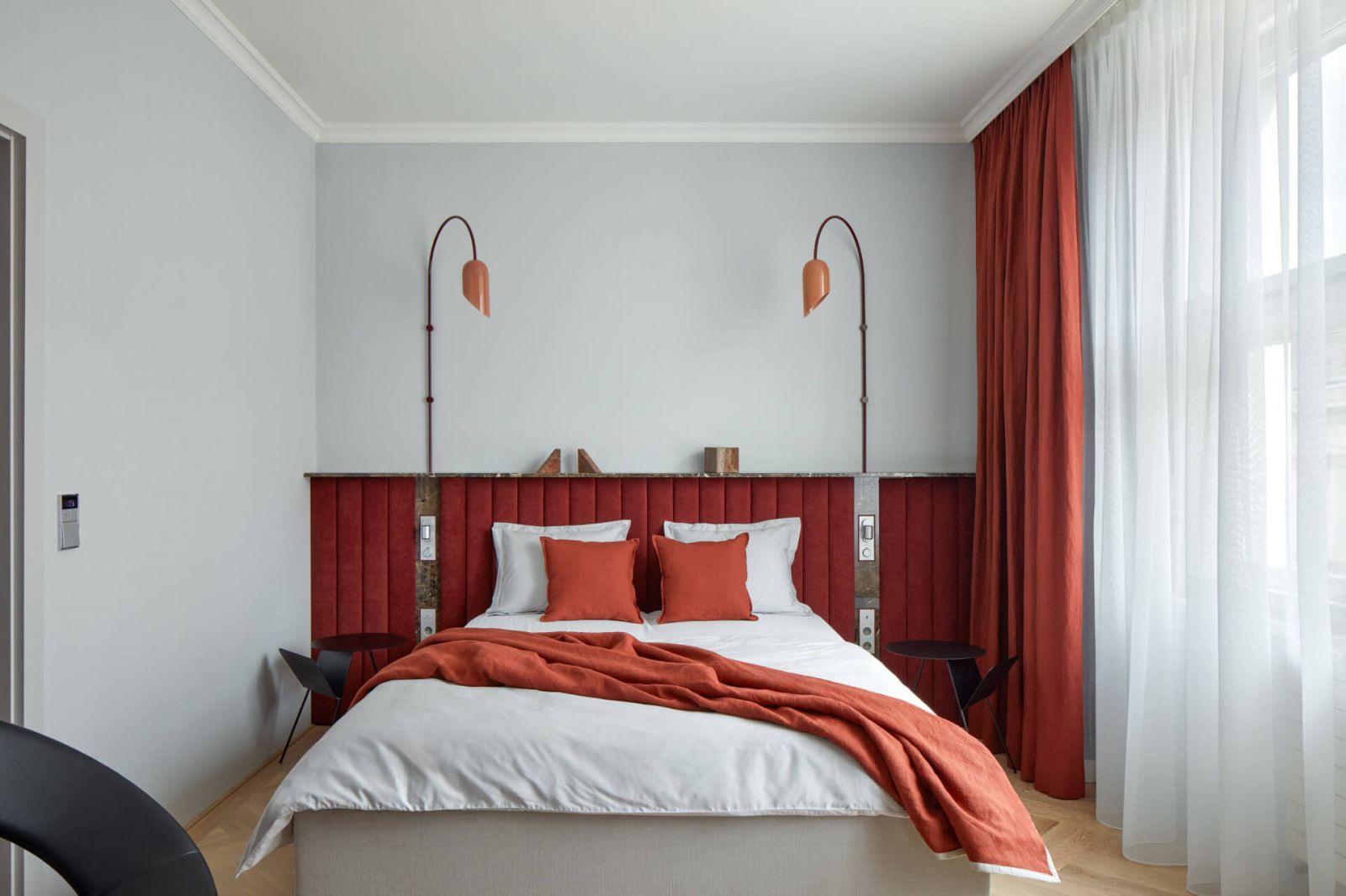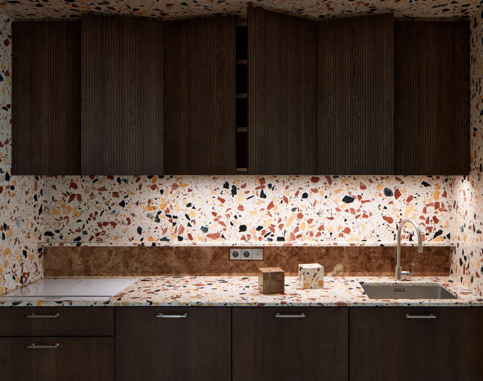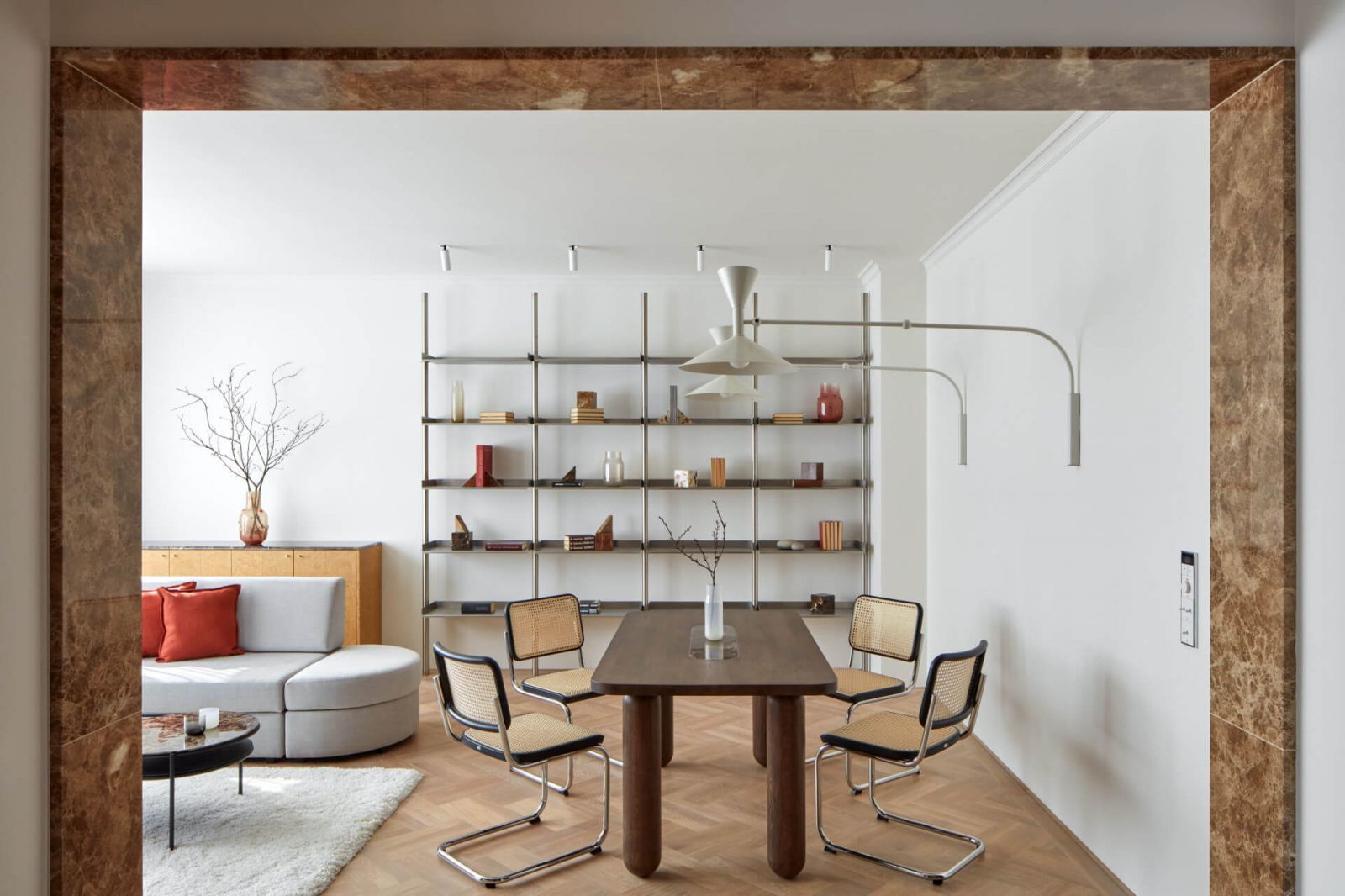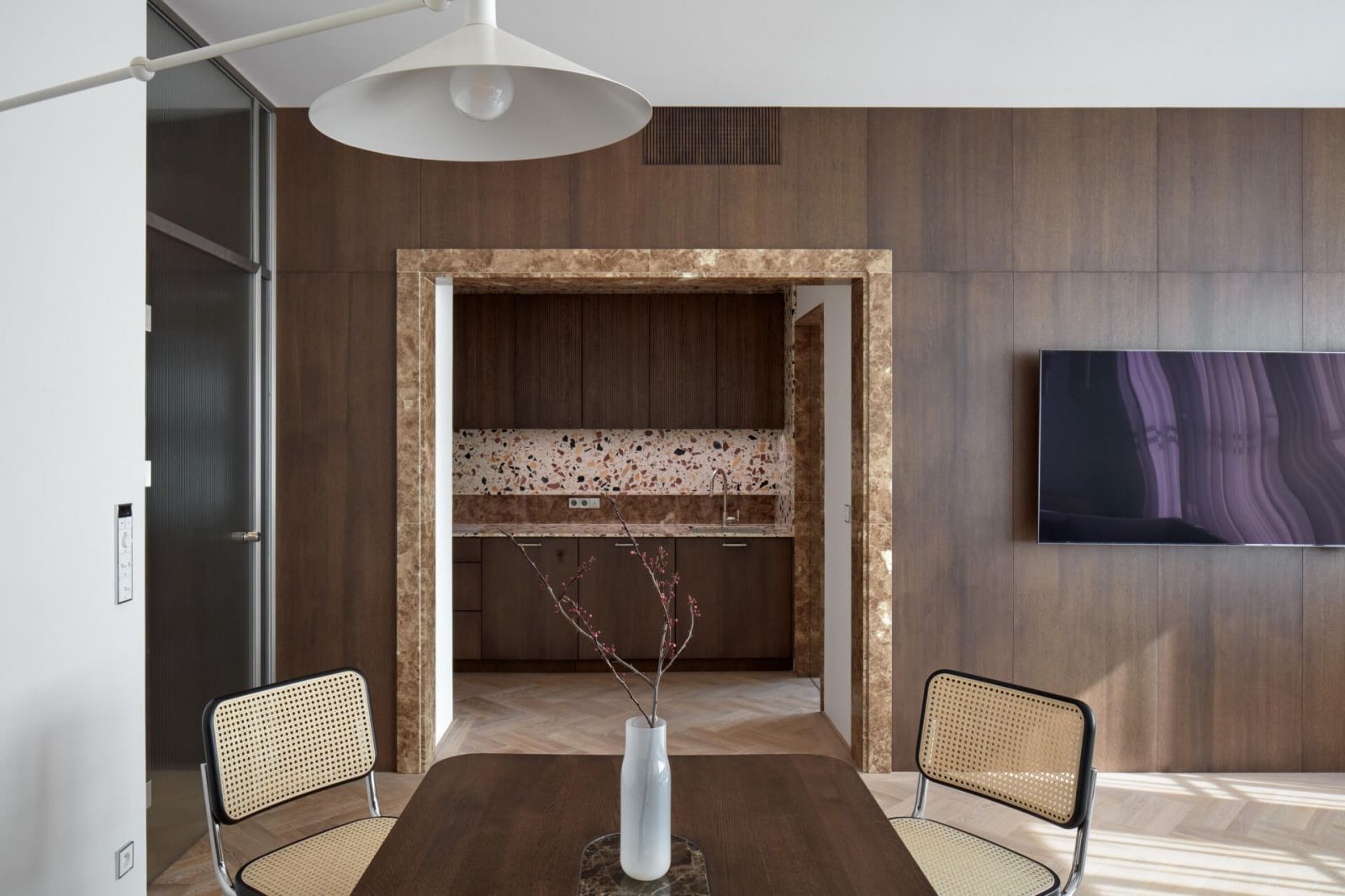 Minimalistický prístup k výberu solitérov v tomto interiéri zabezpečil, že pozornosť sa presúva na vybrané materiály. Netradičná kombinácia tmavého dreva, chrómu, výraznej červenej farby, terazzo vzoru a mramoru vytvára v byte jedinečnú atmosféru. Celým interiérom sa navyše tiahne stromčeková podlaha, typická pre obdobie, keď bol bytový dom postavený.