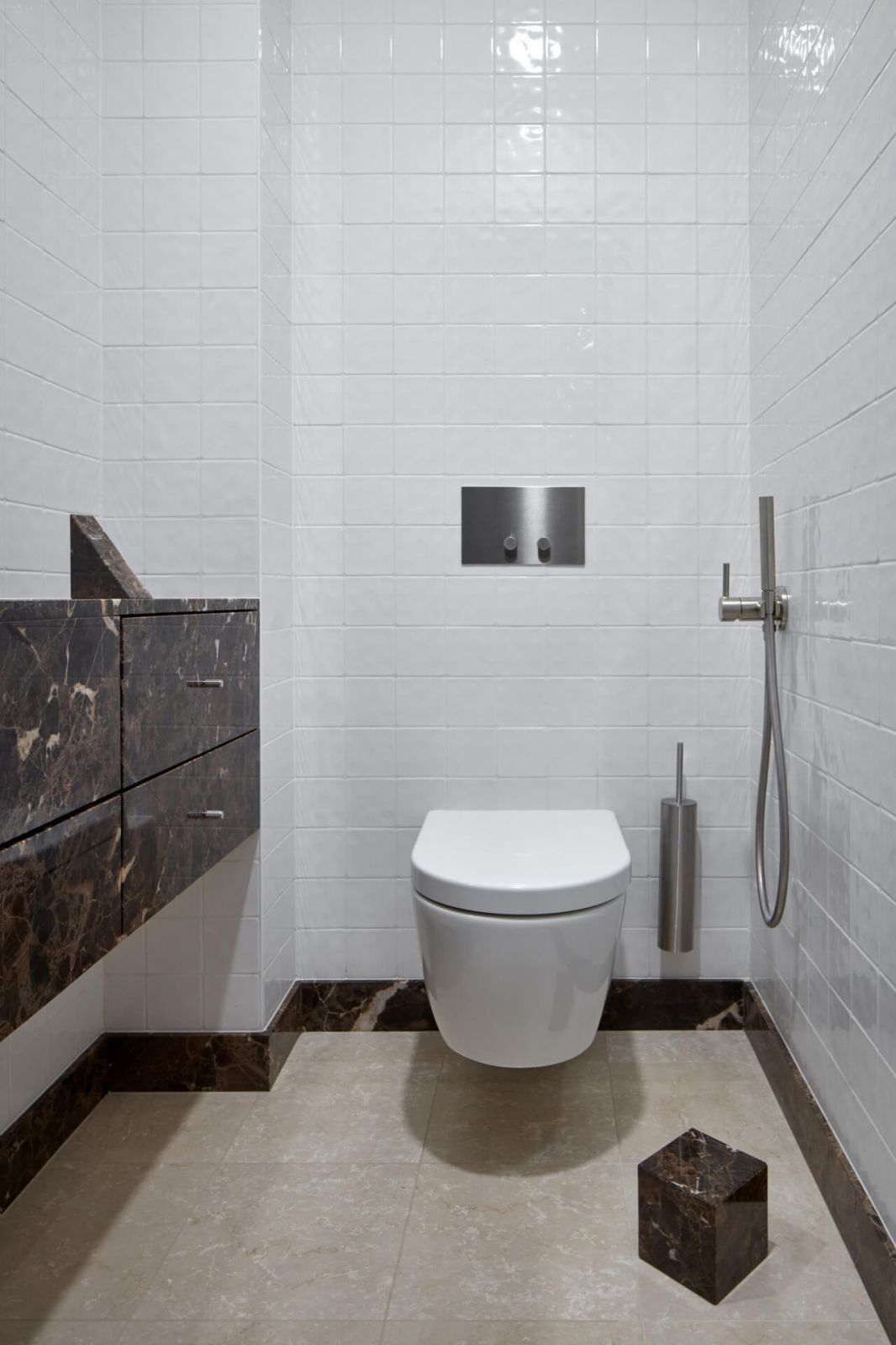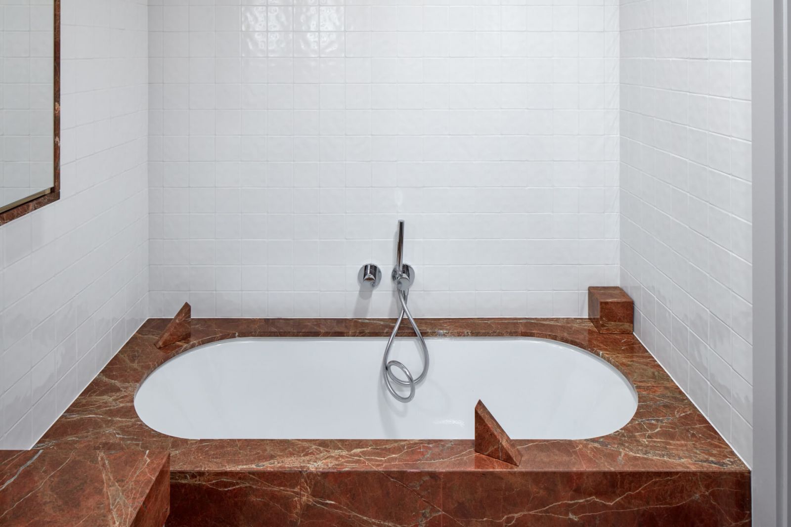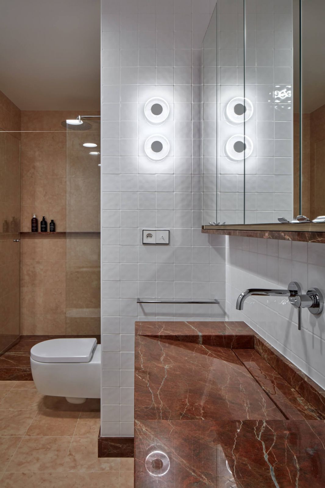 Na rozdiel od dennej miestnosti hlavná spálňa opúšťa neutrálnu paletu materiálov a vyznačuje sa výraznejším koloritom, najmä v časti, kde sa nachádza posteľ. To isté platí aj pre kúpeľňu, kde architektky skombinovali hnedo-červenú dlažbu s výrazným mramorovým vzorom a maloformátovým bielym obkladom. Aj v tejto časti bytu boli v duchu funkcionalizmu použité chrómové detaily, ako sú batérie, držiaky a úchyty.