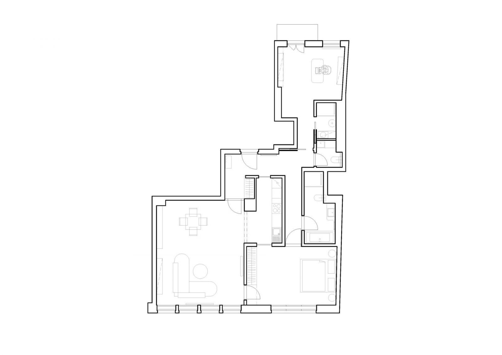 Pri návrhu interiéru staropražského bytu štúdio stavilo na niekoľko výrazných solitérov, atypické svietidlá a netradičnú kombináciu materiálov. Výsledkom je moderné bývanie, ktoré ukážkovo reflektuje funkcionalistický prístup k dizajnu aj históriu štvrte, v ktorej sa byt nachádza. Zároveň je toto dielo naplnením hesla, ktorým štúdio opisuje svoju prácu: „Ideme do detailov. Spájame racionálne a emočné kvality a vytvárame nadčasový dizajn.“