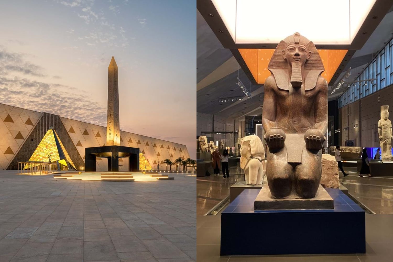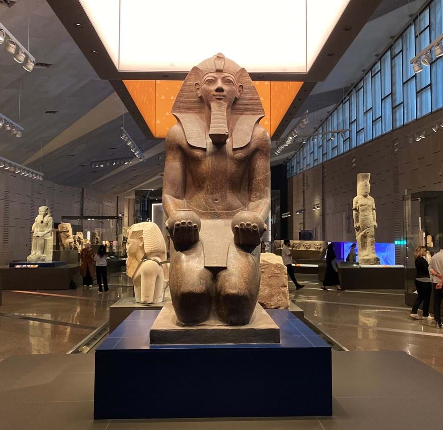 Hlavná hala so sochou faraóna Ramzesa II slúži ako prechodový priestor – svetlom zaliaty interiér odhaľuje výhľad priamo na Cheopsovu pyramídu, čím sa architektúra stáva súčasťou naratívu expozície. K splynutiu s prostredím prispievajú aj pieskovcové materiály a monumentálne priestory, ktoré reagujú na okolitú púšť.