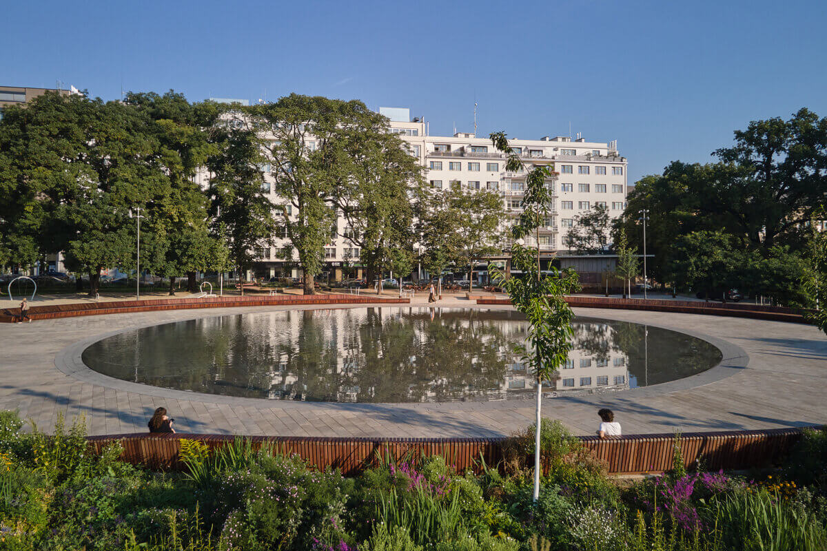 Dominantou tohto verejného priestoru sa stala centrálna plocha s fontánou, ktorá je po takmer celom svojom obvode doplnená o atypickú drevenú lavicu. „Samotná lavica nabáda k slobode pohybu, kedy je dovolené ležať, sedieť, váľať sa, hrať sa, a to všetkým vekovým skupinám obyvateľov,“ hovoria autori a dodávajú: „Plocha fontány sa naopak stáva javiskom. Vždy je na čo sa pozerať a vždy sa niečo deje.” Okrem toho pribudla aj kaviareň, detské ihrisko, množstvo menších chodníkov a udržiavaná zeleň.