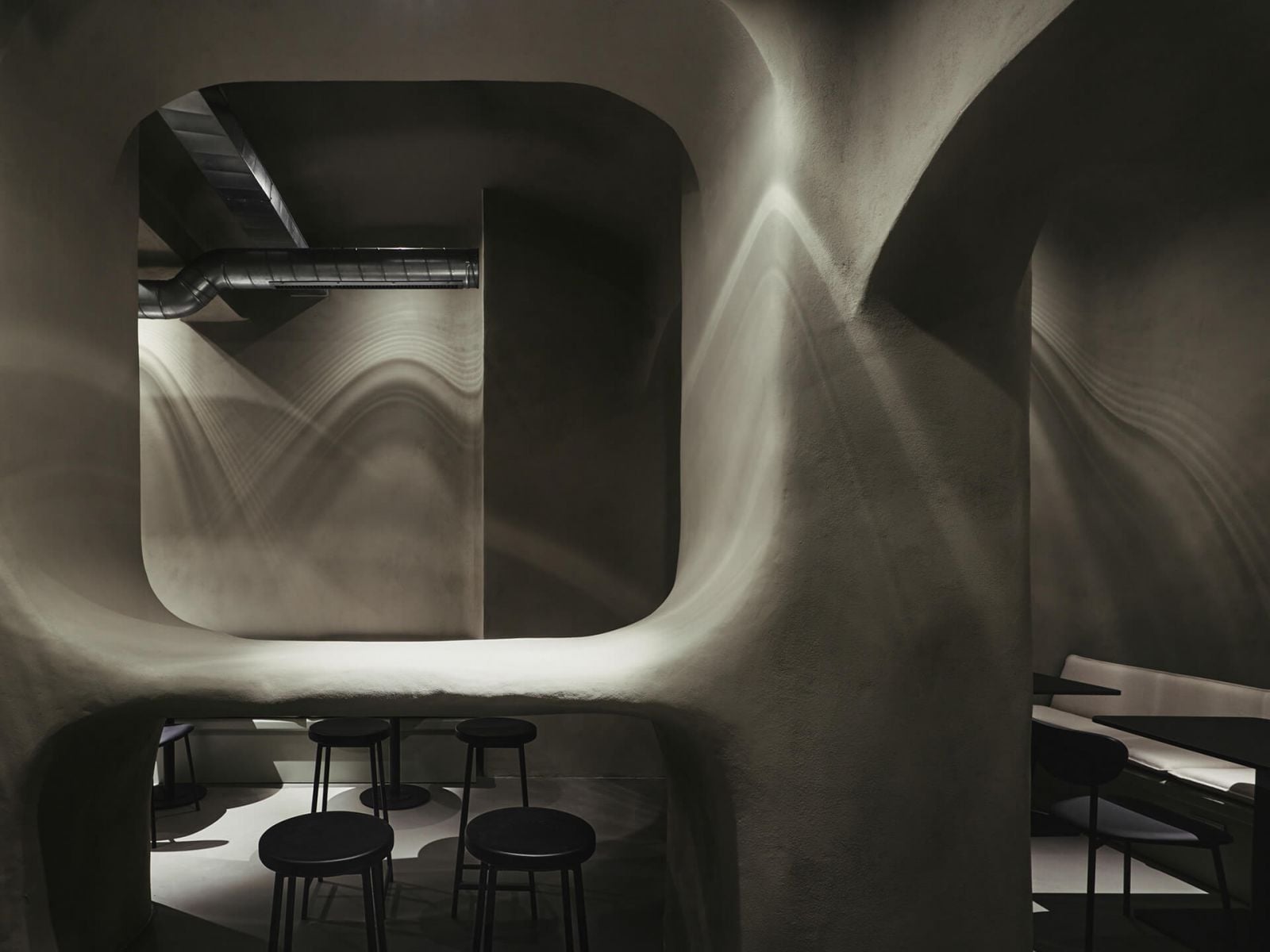 Zatiaľ čo „denná časť podniku“ stavia na koncepte otvoreného a presvetleného priestoru, nočná časť ponúka zákazníkom jedinečnú a o čosi intímnejšiu atmosféru. V duchu organických tvarov tu boli navrhnuté tiež prechody medzi miestnosťami či deliaca stena slúžiaca aj ako stôl na sedenie.