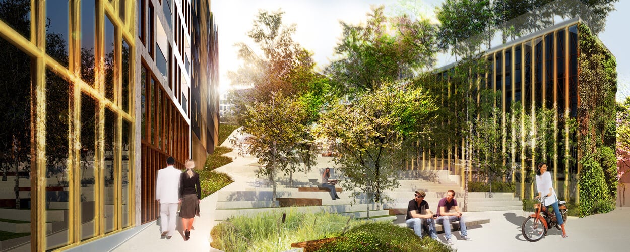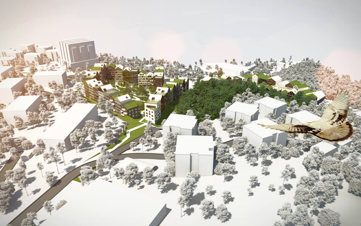Domy orientované do svahu mali mať na prvých dvoch podlažiach garáže. Architekti navrhovanú hmotu perforovali a vo vstupnom námestí, hlavnom námestí a parkovom vnútrobloku vytvorili priečne prepojenie s Gaštanovou záhradou.