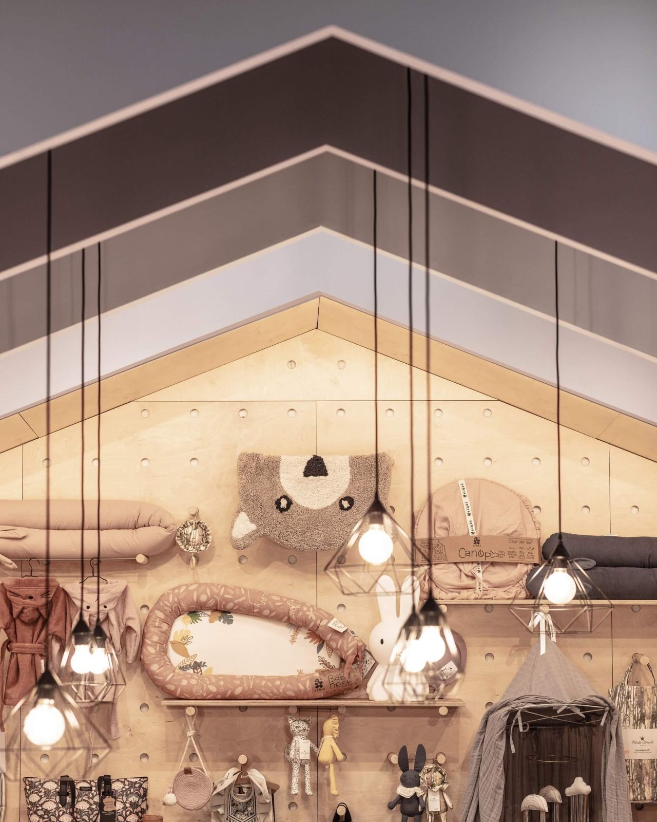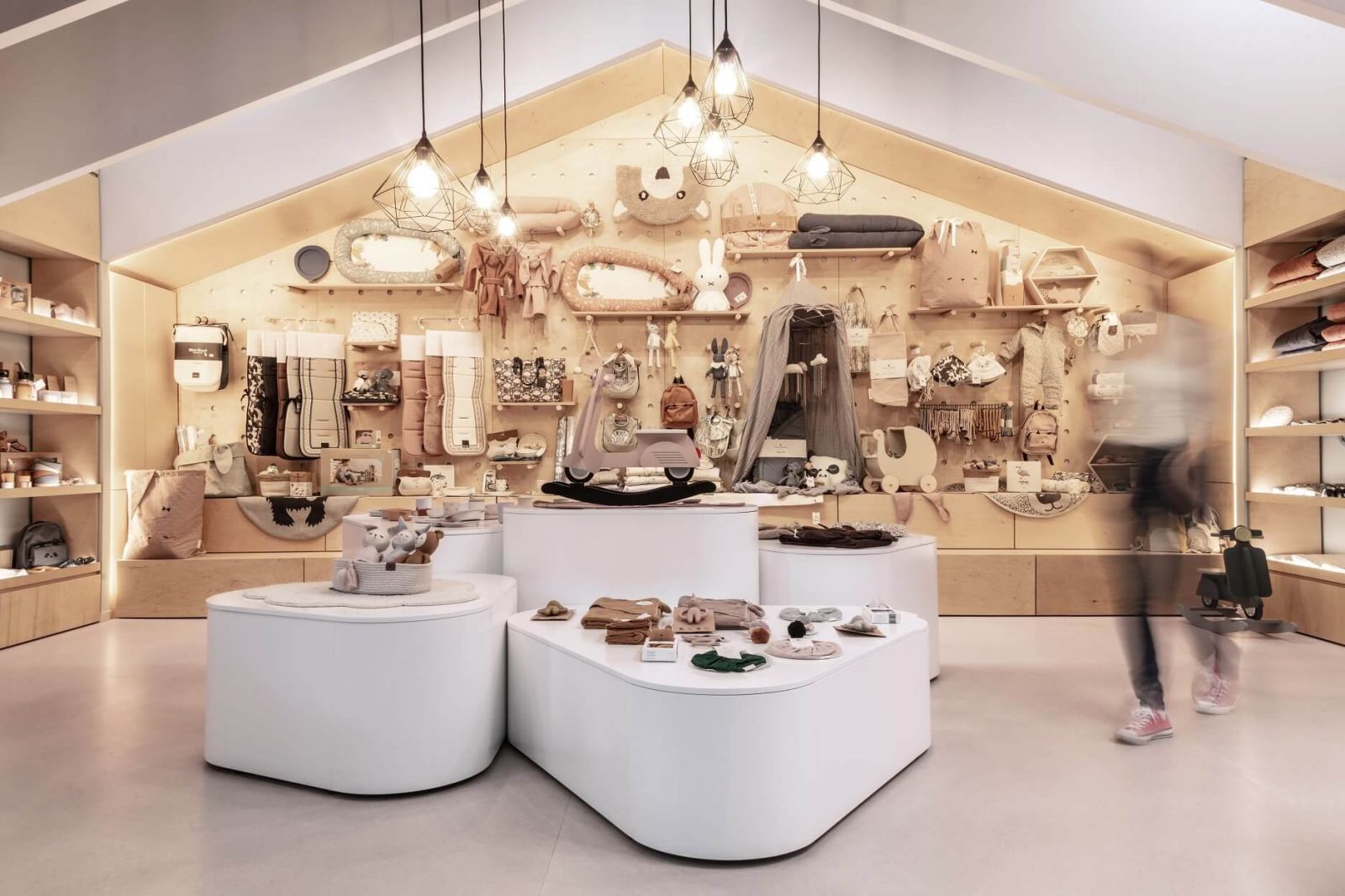 Rovnako dôležité bolo aj zachovanie otvoreného pôdorysu predajne. V strede celej dispozície sa preto nachádzajú len atypicky tvarované a mobilné výstavné prvky bielej farby. Zvyšné produkty sú umiestnené po okrajoch predajnej plochy. Pri vstupe do predajne sa nakupujúcim naskytne pohľad na dominantnú PEG board stenu v tvare domčeka, ktorej súčasťou sú viaceré vešiaky či police. Samotné rozloženie si majitelia obchodu môžu prispôsobiť podľa aktuálne predávaného tovaru. S cieľom zútulniť celý priestor a zvýrazniť vystavované produkty bolo táto stena navrhnutá zo svetlého dreva a podsvietená LED pásmi po stranách.