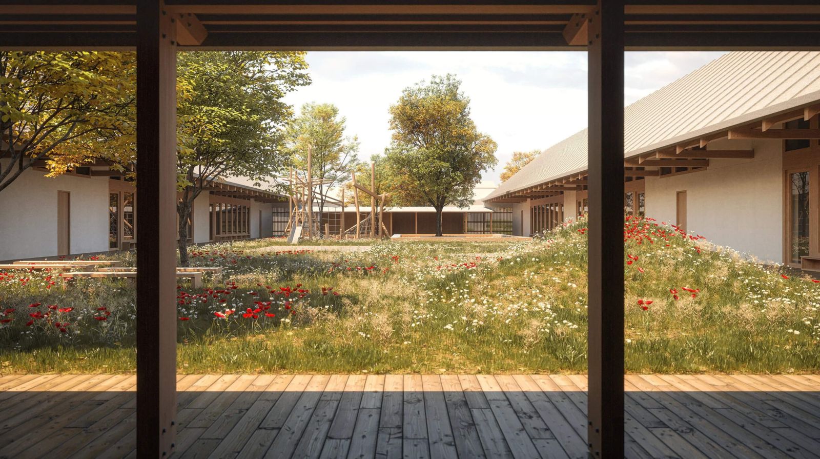 Dôležitou súčasťou návrhu bolo aj posilnenie vzťahu interiér-exteriér, čo sa podarilo najmä vďaka orientácii jednotlivých učební priamo do školského dvora. V čase pekného počasia je dokonca možné časť presklenej fasády naplno otvoriť, a tým priamo prepojiť vnútorné a vonkajšie priestory do jedného celku. Samotná záhrada je rozdelená na päť častí, každá z nich je inšpirovaná iným prírodným prostredím - hory, les, lúka, púšť a džungľa. Dvor však nemá slúžiť len žiakom materskej školy. Mimo vyučovania môže byť tento exteriérový priestor využívaný na organizáciu rôznych komunitných aj kultúrnych akcií.