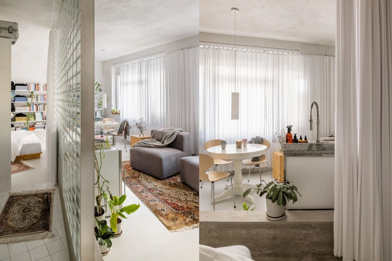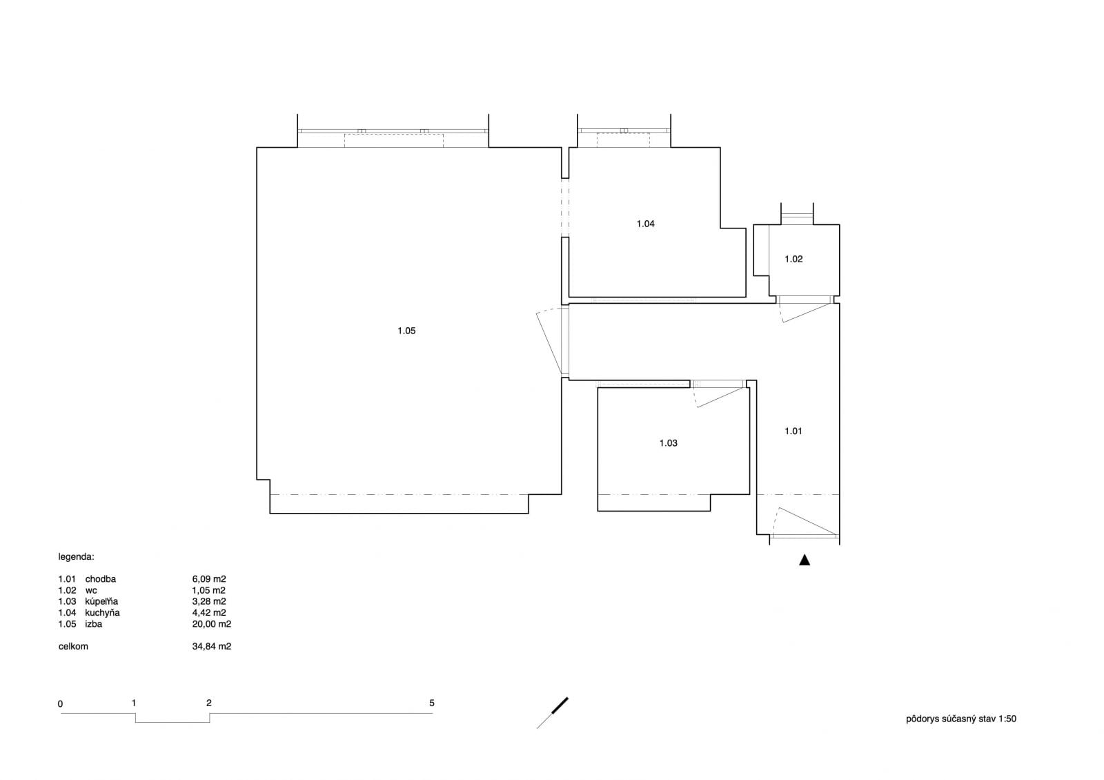 Súčasťou návrhu bolo odstránenie takmer všetkých priečok v byte, vďaka čomu mohla vzniknúť jedna priestranná miestnosť, ktorá v sebe spája všetky potrebné funkcie. Úplne oddelená v rámci dispozície neostala ani toaleta ukrytá za priečkou s otvorom v plnej výške.