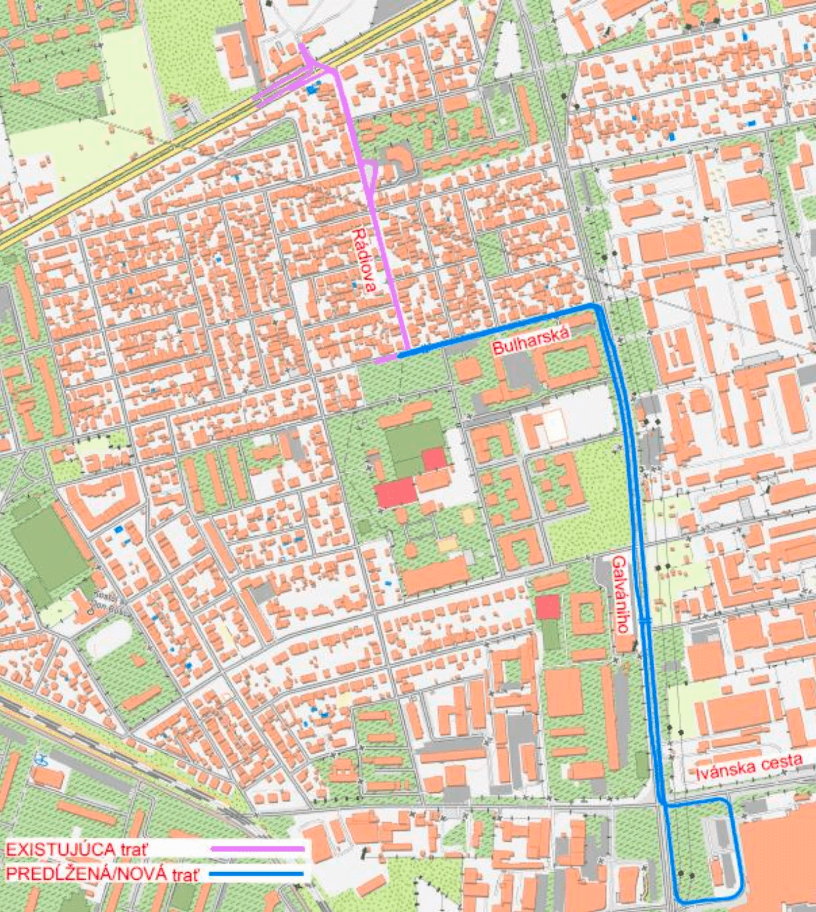 Trolejbusová trať Bulharská – Galvaniho. Zdroj: DPB / EIA