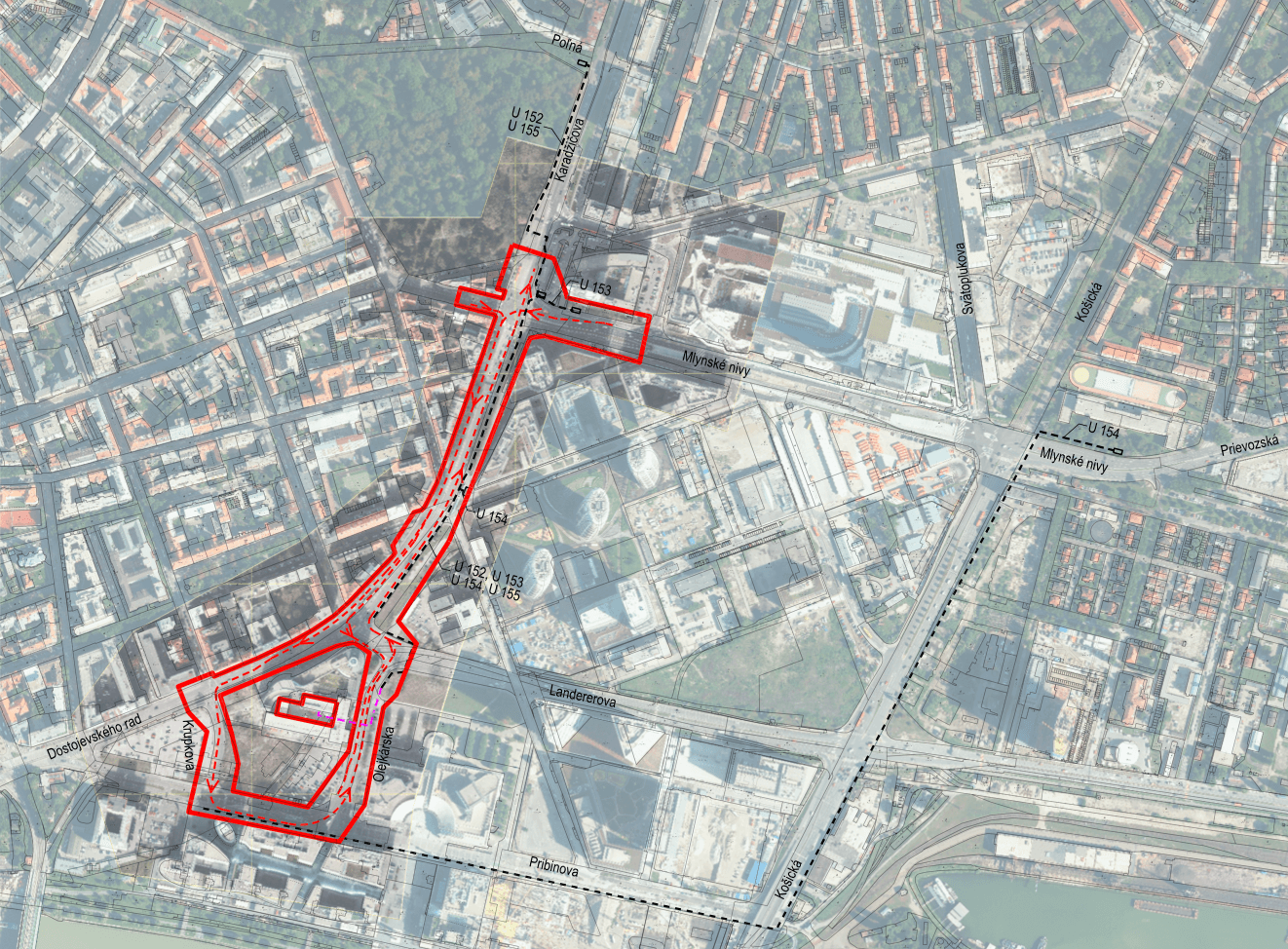Ako ďalej informuje zámer, stopa, odbočujúca do ulice Krupkova, by vytvorila okruh – pokračovala by na Pribinovu s odbočením na Olejkársku a ďalej po Landererovej až na Dostojevského rad. Investor si od takto navhrnutého okruhu sľubuje predĺženie trate pomocou hybridných trolejbusov až pod most SNP bez potreby trakčného vedenia. Je tu však nutná slepá stopa na zastávku Nové SND. V tomto prípade by si to vyžadovalo použitie najdlhších hybridných 24-metrových trolejbusov. Navrhovanú trať bude ďalej tvoriť aj úsek od Autobusovej stanice po Pribinovu o dĺžke 750 metrov.