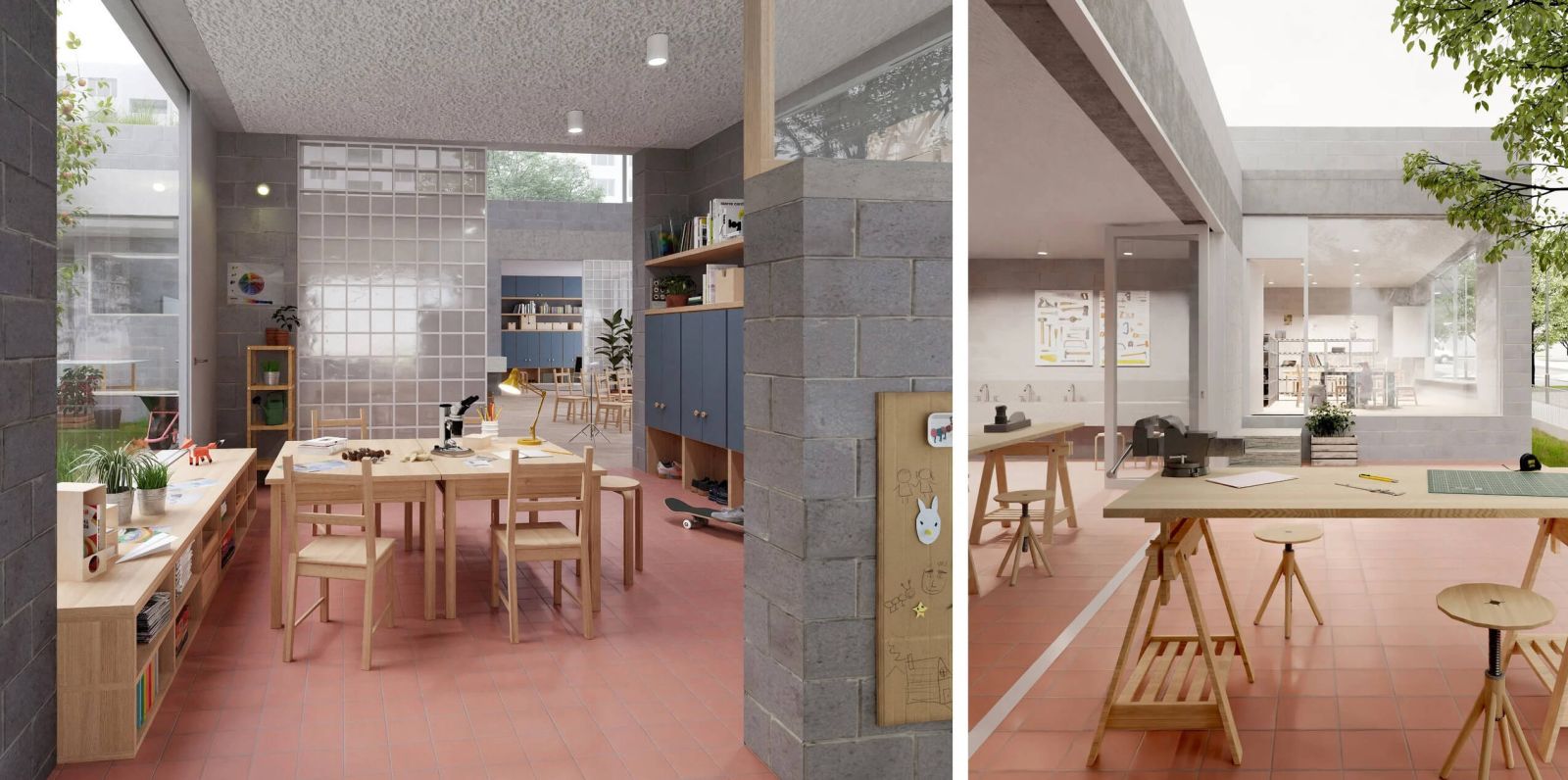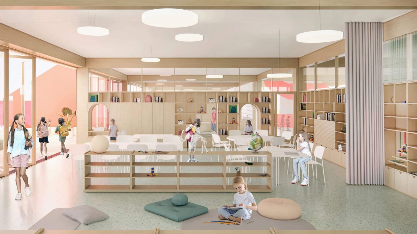 Vo vnútorných priestoroch architekti navrhli variabilný nábytok, množstvo zákutí, odpočinkových plôch či priestory s výhľadom na okolité vonkajšie priestory. Deti sa môžu po priestoroch školy pohybovať voľne, čo vychádza z hlavných princípov montessori výučby. Riešenie vnútorných priestorov v rovnakej miere podporuje samostatnú prácu aj prácu v skupinách. Podľa odbornej poroty bol výber víťaza v podstate veľmi jednoduchý. Návrh od tohto súťažného kolektívu totiž „presvedčil porotu komplexným prístupom, ktorý najlepšie napĺňa požiadavky zadania súťaže.”