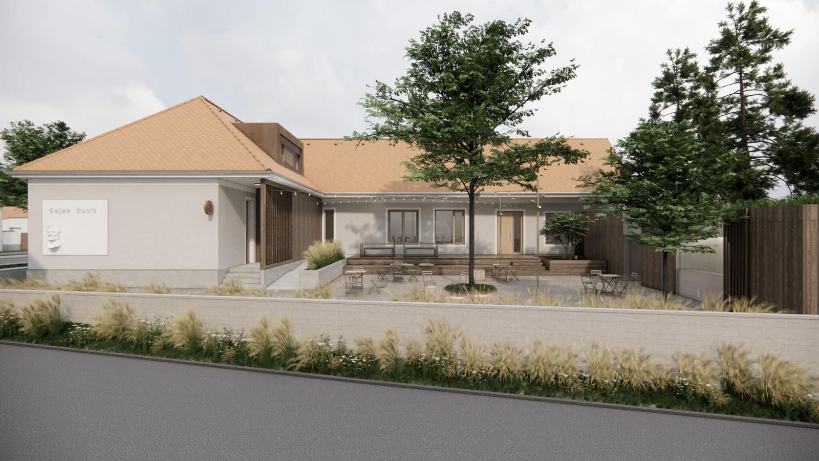 Znížením tehlového múrika vedúceho popri ceste sa zabezpečí lepší výhľad na neďaleký kostol s historicky významnou rotundou. Bezbariérový pohyb bude v rámci objektu zabezpečený novonavrhovanou rampou. Vo dvore sa má nachádzať tiež jednoduchý voľne stojaci mobiliár v podobe stoličiek, stolov, ako aj nové osvetlenie či stojany na bicykle. Súčasťou projektu bude tiež výsadba niekoľkých stromov. Na nároží objektu bude osadená nová pamätná tabuľa, venovaná osobnosti Gejzu Dusíka.