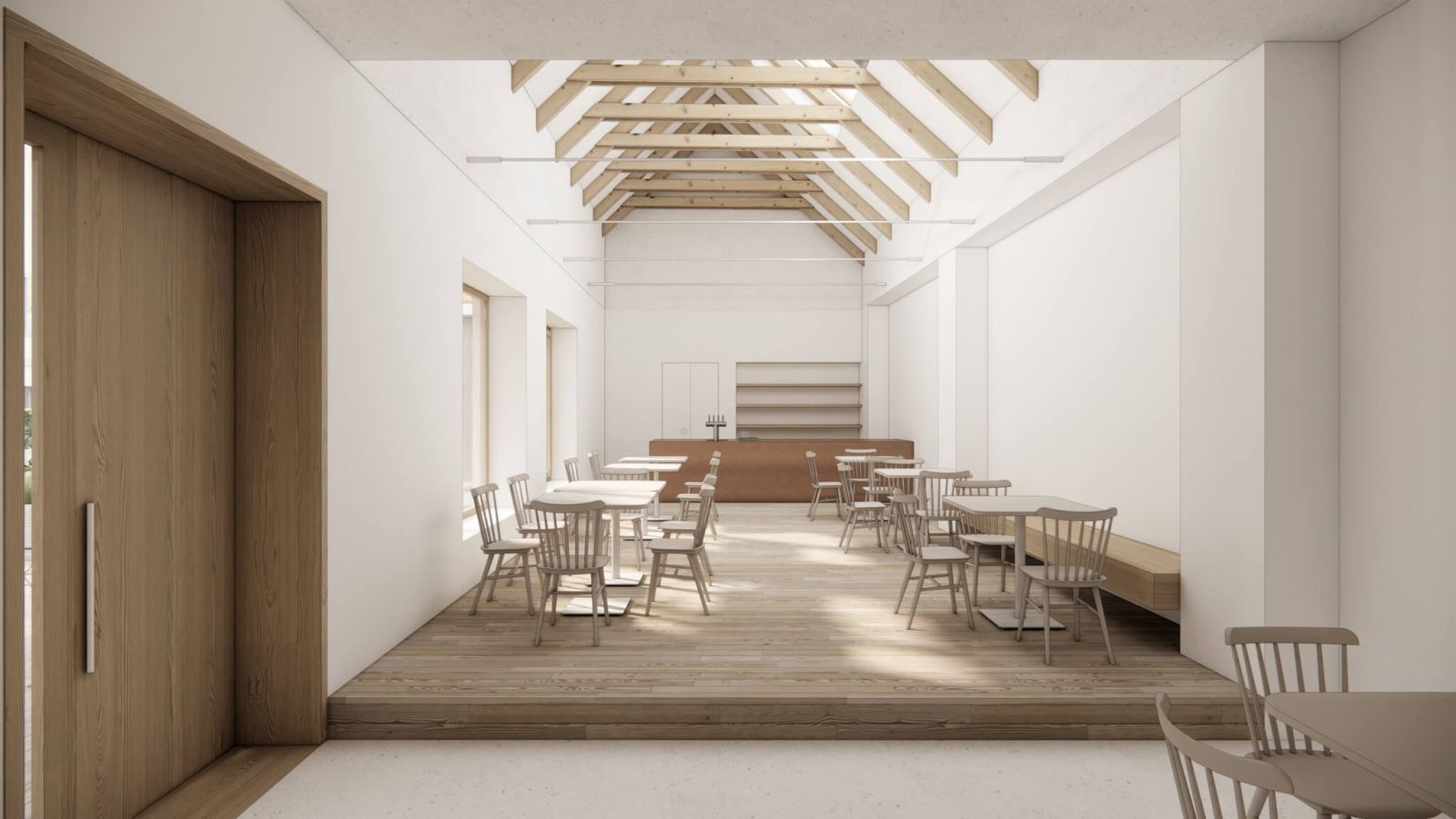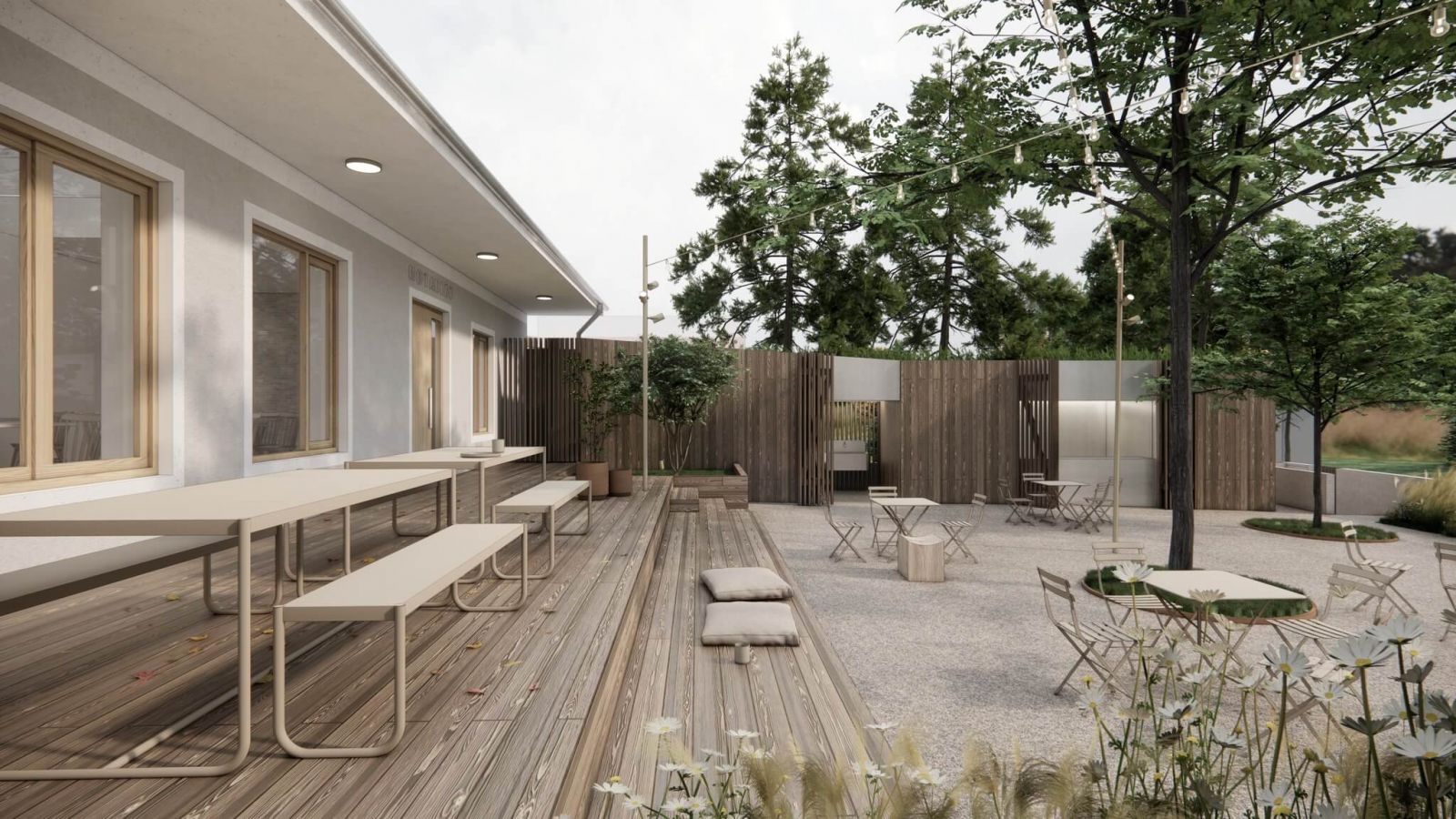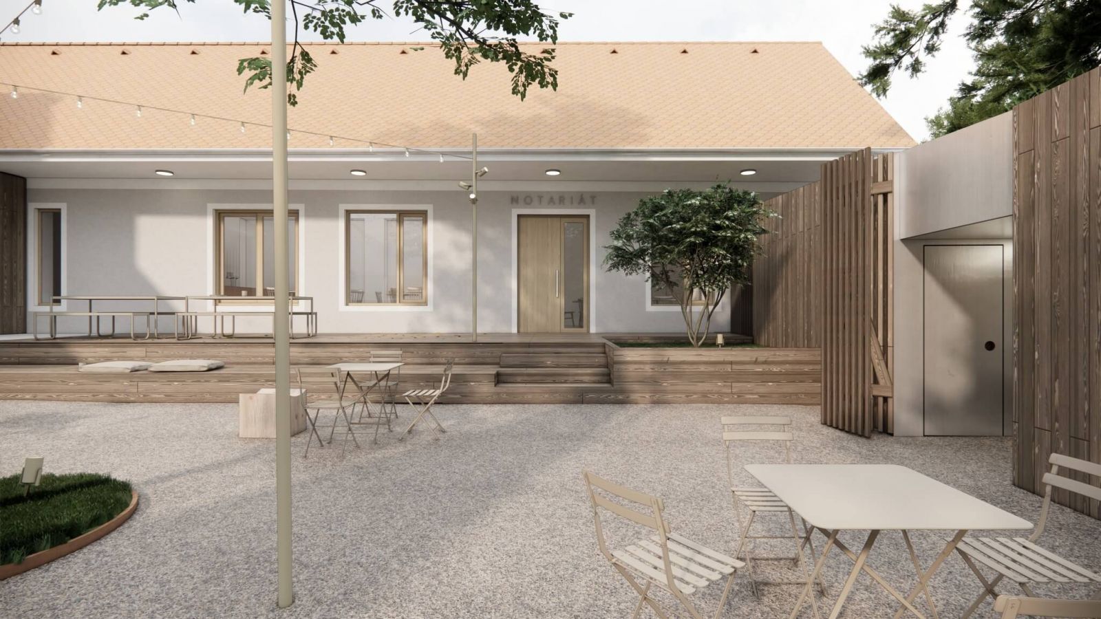 V zadnej časti bývalého notariátu sa najvýraznejším prvkom stane drevená exteriérová terasa, ako aj drevený prvok, oddeľujúci dvor od vchodov do jednotlivých prevádzok. Súčasťou projektu je tiež výstavba menšieho objektu v dvore notariátu. Ten by mal podľa architektov plniť funkciu zmrzlinárne a hygienického zázemia. Z materiálového hľadiska budú nové zásahy od existujúceho objemu ľahko odlíšiteľné. Fasáda nového objektu ako aj terasa či nadstavba v streche budú obložené dreveným obkladom. Strecha dostavaného objektu zmrzlinárne bola v rámci štúdie navrhnutá ako rovná a zatrávnená.