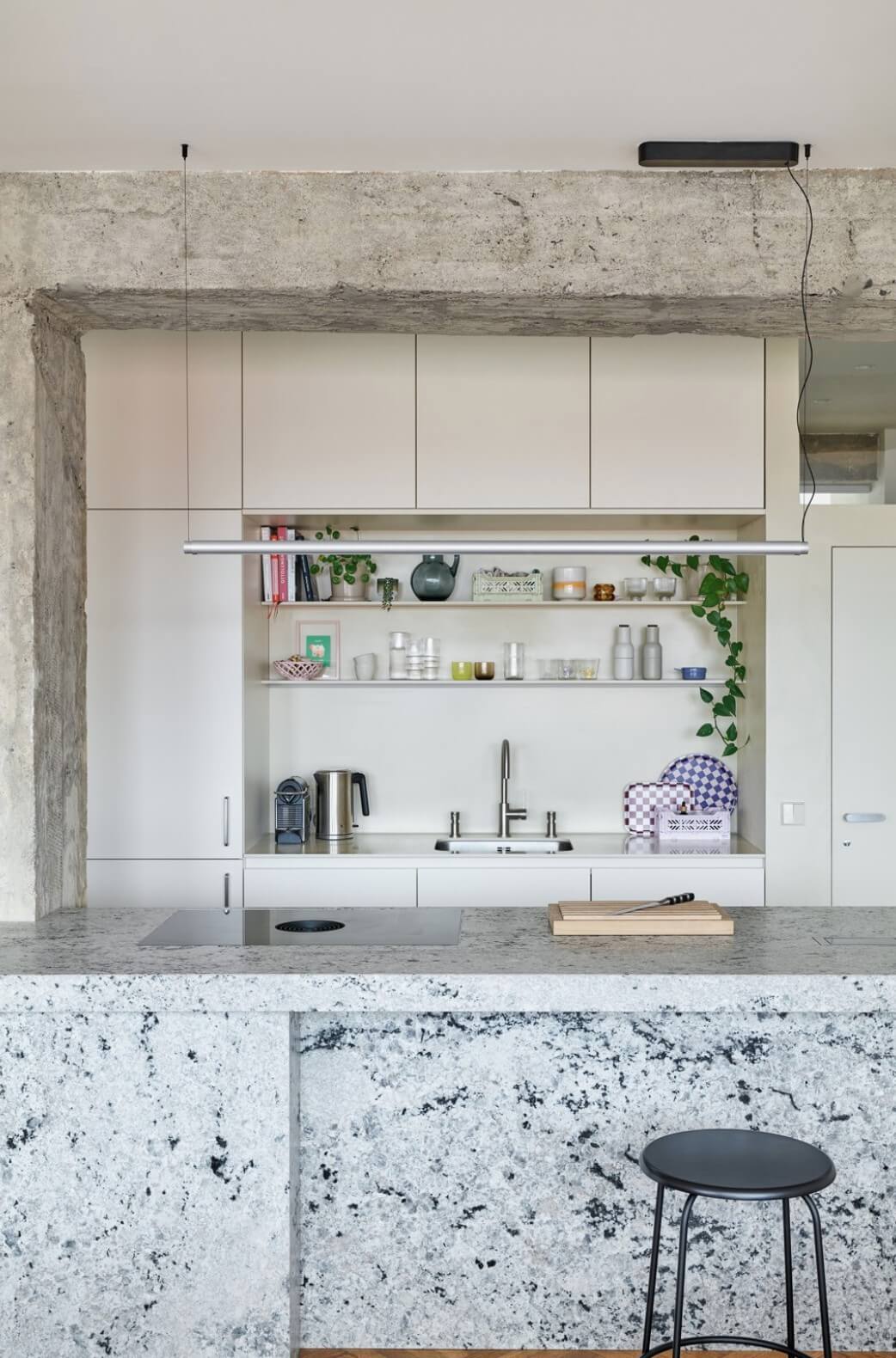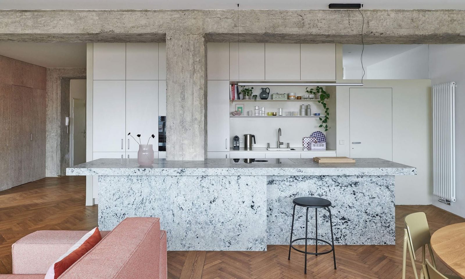 Ústredným prvkom dennej miestnosti sa stal barový ostrov, osadený pod betónový preklad. Z materiálového hľadiska sa vyznačuje svetlým žulovým obkladom, ktorý je v kontraste so zachovanou betónovou nosnou konštrukciou i so samotnou kuchyňou. Tá bola v duchu minimalizmu navrhnutá v jemnej smotanovej farbe.