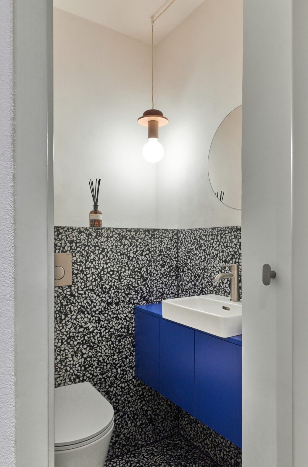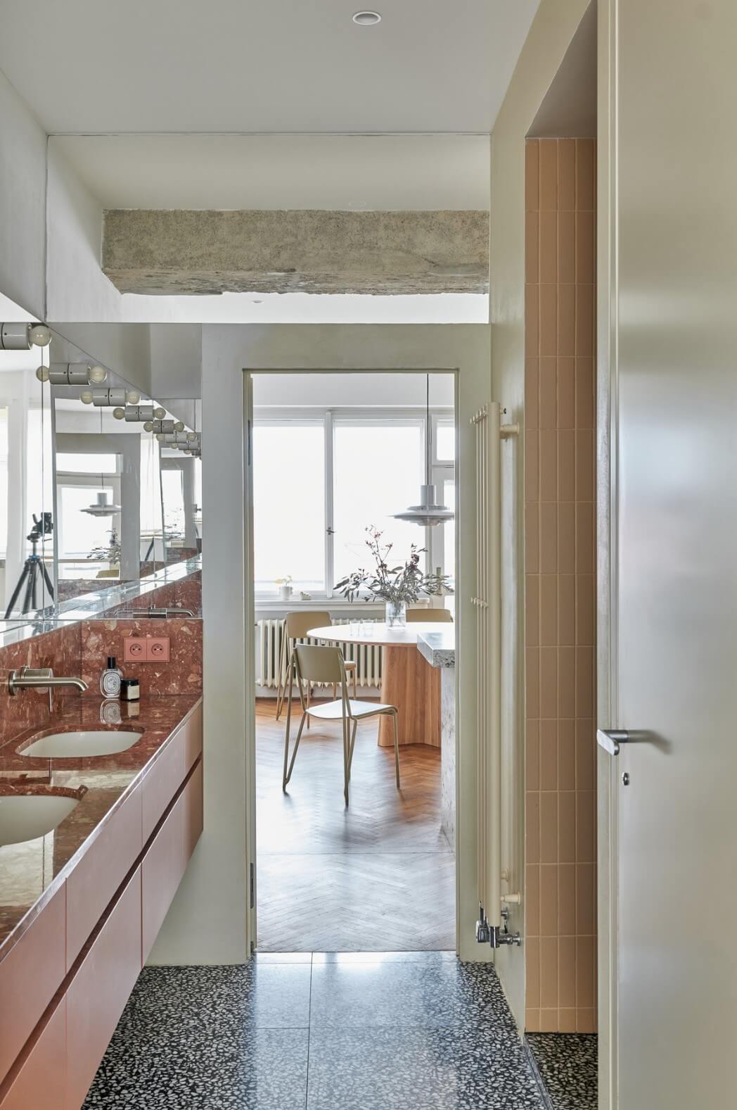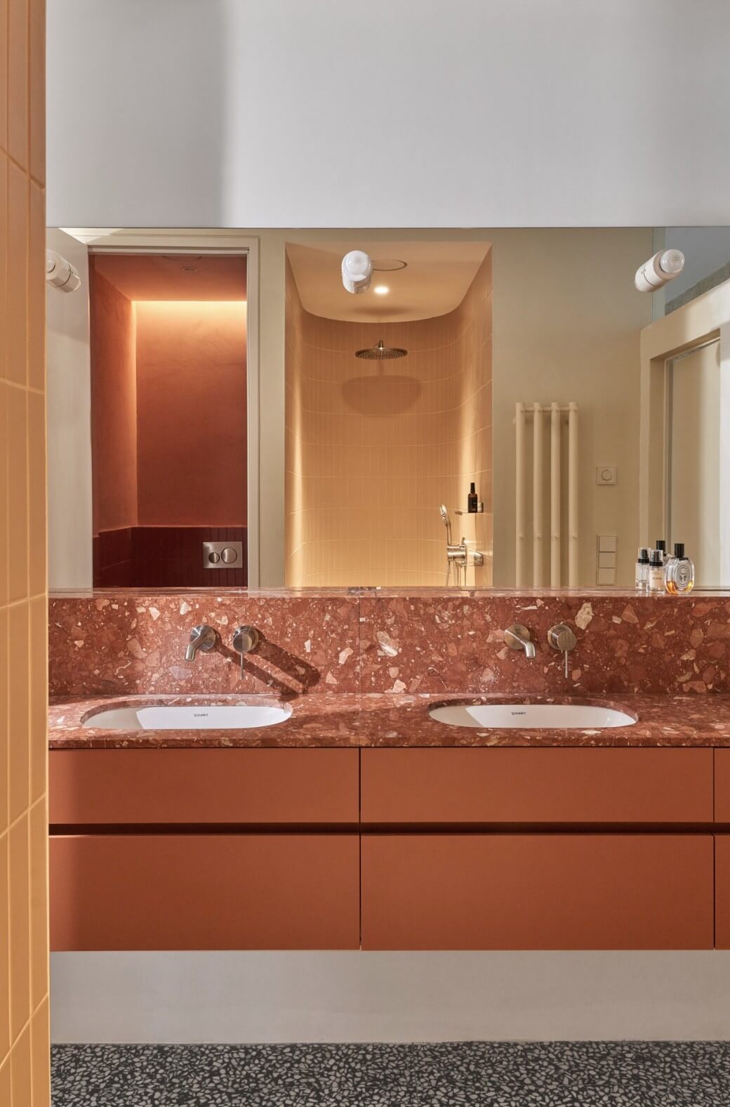 Táto miestnosť sa vyznačuje špecifickou farebnosťou. V kúpeľni nájdeme rôzne odtiene oranžovo-ružovej farby, ktorá sa objavuje vo sprchovom kúte, na obkladoch a stenách zóny vyhradenej pre toaletu, ako aj na umývadlovej skrinke. Celkovú atmosféru následne dotvára výrazná terazzo farba a veľkoformátové zrkadlo.