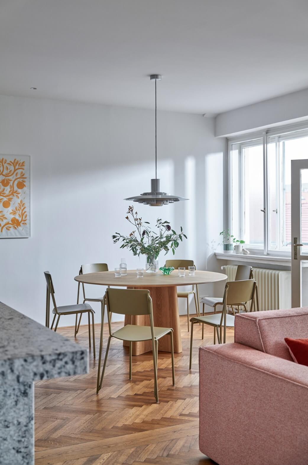 Kuchynská linka zároveň plynulo prechádza do stenového obkladu rovnakej farby, vďaka čomu ostávajú dvere do jednej z kúpeľní v celom priestore nenápadné. Zvyšnú časť miestnosti následne zaberá okrúhly jedálenský stôl doplnený o výrazné závesné svietidlo a obývacia časť, kde sa dominantou stala svetloružová sedacia súprava.