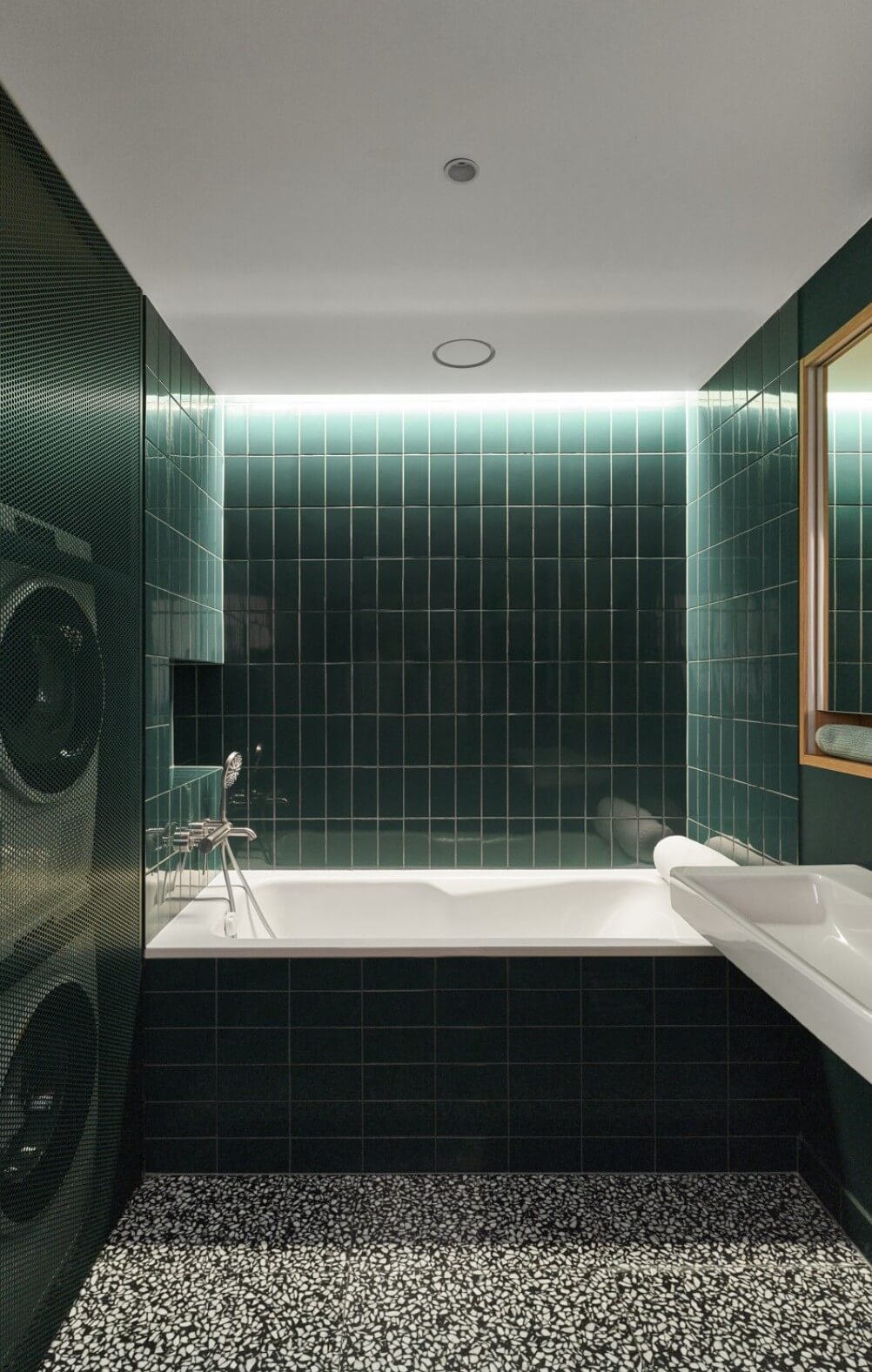 Zároveň dodáva, že sa nový interiér inšpiroval samotným funkcionalistickým domom, a to najmä v materiáloch a farebnosti. Tmavšia kúpeľňa má výraznú terazzo dlažbu a smaragdový obklad. Okrem vane sa tu nachádza tiež priestranné umývadlo a úložný priestor pre práčku. Celkovú atmosféru miestnosti podčiarkuje LED pás umiestnený nad vaňou. „Druhá kúpeľňa tvorí zároveň prechod medzi spálňou a obytným priestorom, odkiaľ vedú skryté dvere. Od spálne sa dá oddeliť posuvným panelom, väčšinou však ostáva otvorená a stretáva sa v nej denné svetlo z oboch strán,“ dopĺňa architektka.